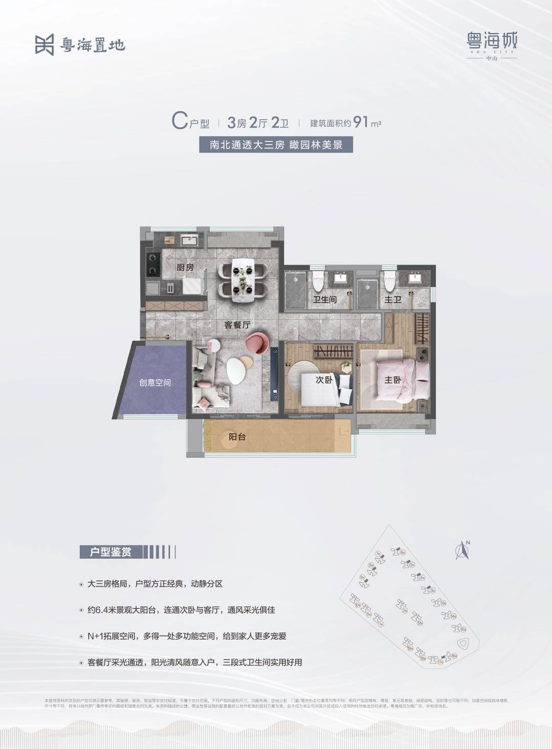 C戶(hù)型:建面約91m² 3房2廳2衛(wèi)