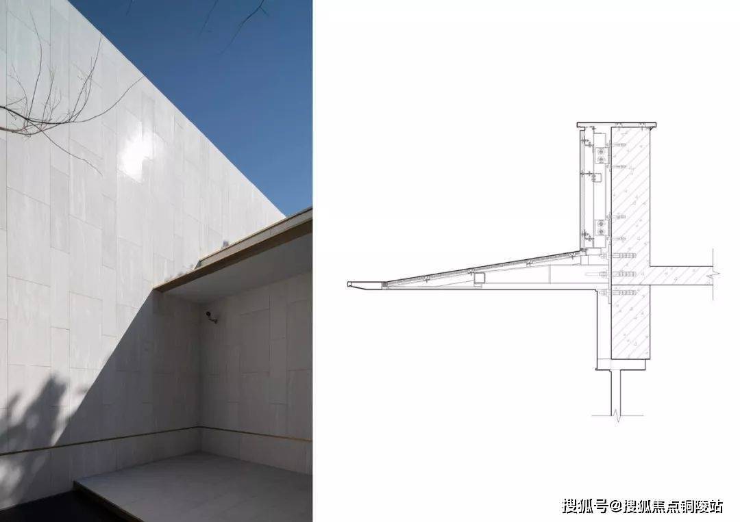 各屋頂檐口下部均設(shè)置有滴水線,防止吊頂掛污。干掛預(yù)制混凝土板采用密縫形式,使得景墻效果整齊劃一。
