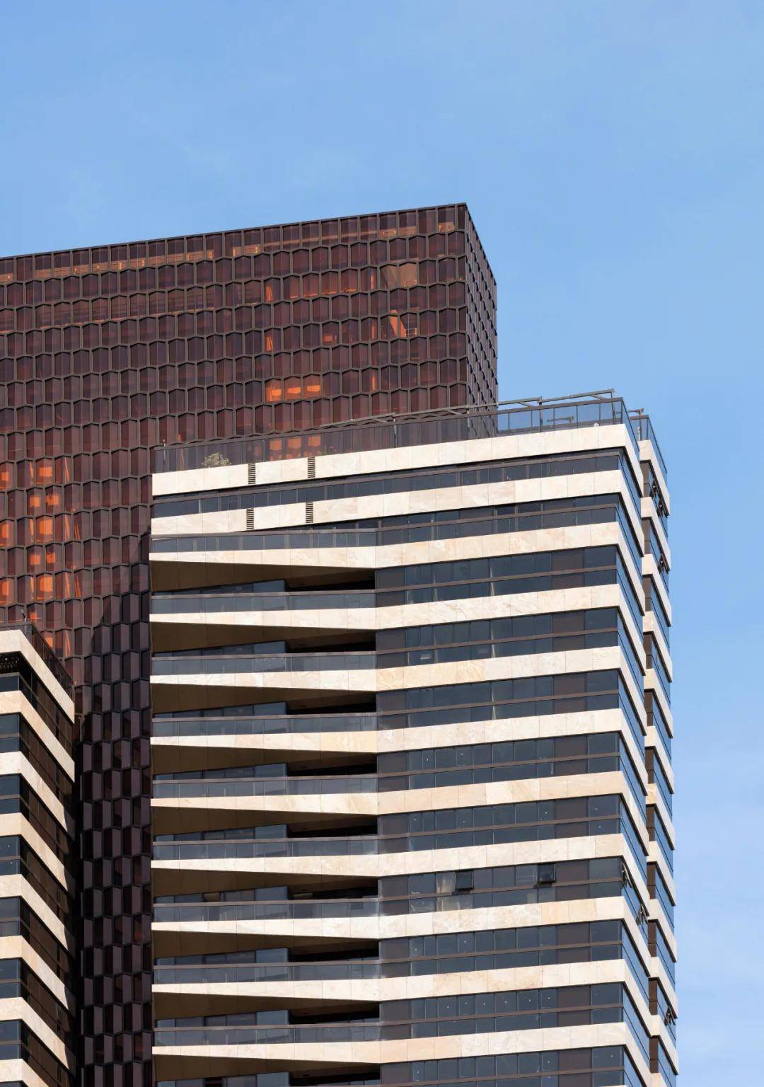 B的外立面采用干掛石材,部分采用真石漆,建筑為現(xiàn)代簡(jiǎn)約風(fēng)格,遠(yuǎn)處望去整個(gè)建筑簡(jiǎn)潔明快,而又不失奢華。看起來(lái)就比A高級(jí),橫縱向都做了非常漂亮的裝飾線,整個(gè)立面呈現(xiàn)出很有線條感的感覺(jué),空調(diào)掛機(jī)被遮擋起來(lái),保持外立面的整潔利落。
