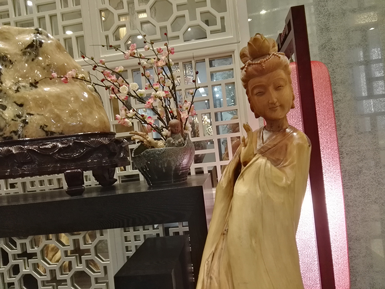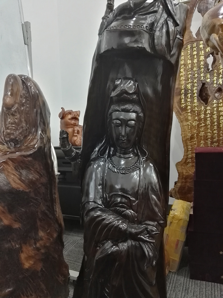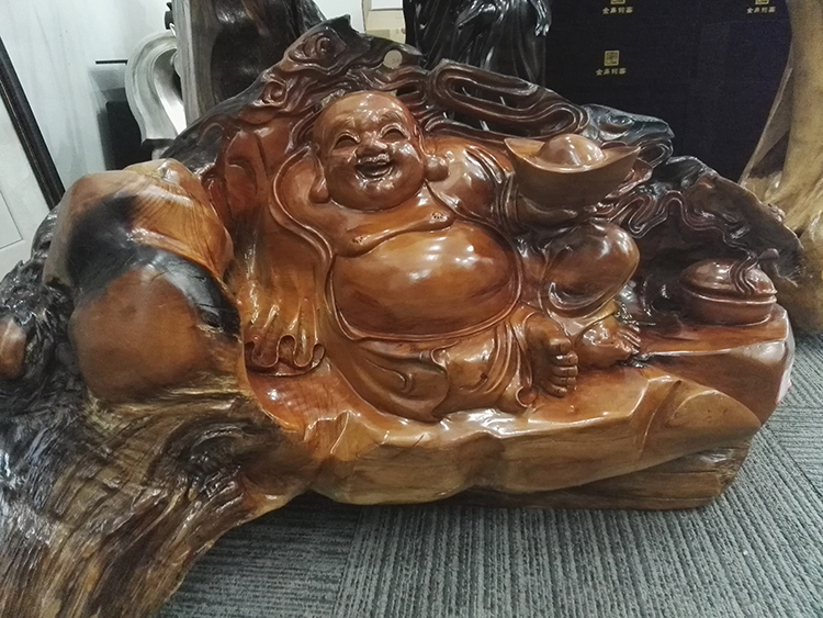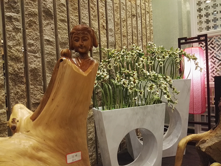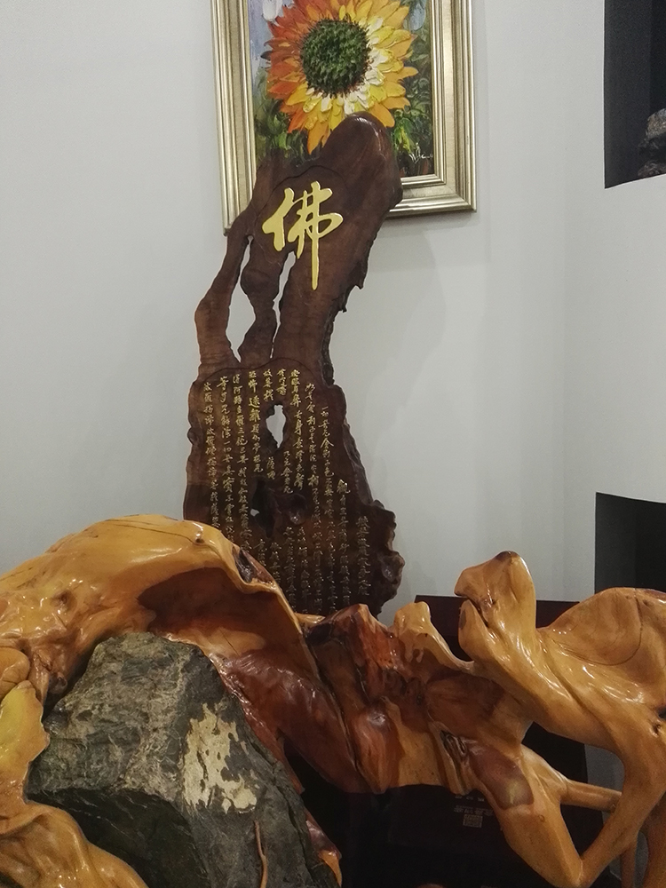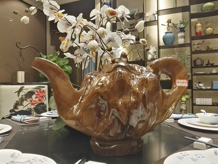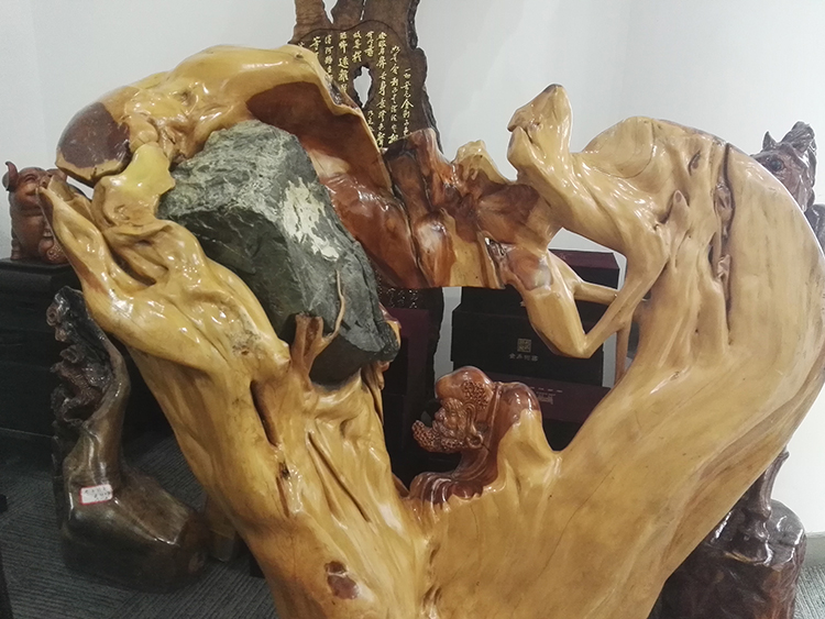 劉總向陳先生介紹寶億萊軟裝如何運用根雕藝術(shù)品