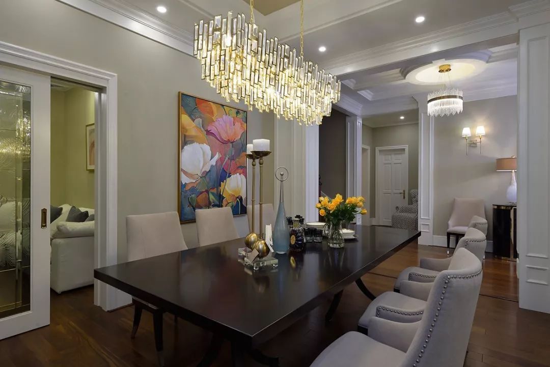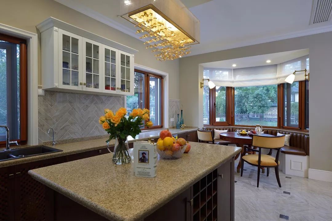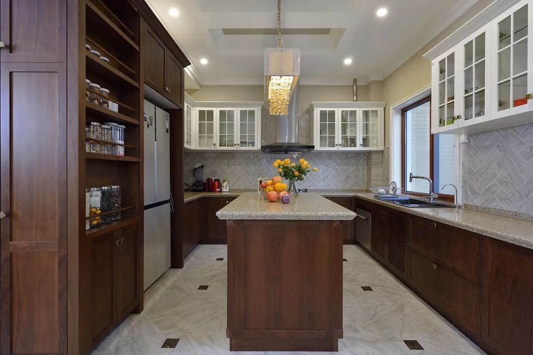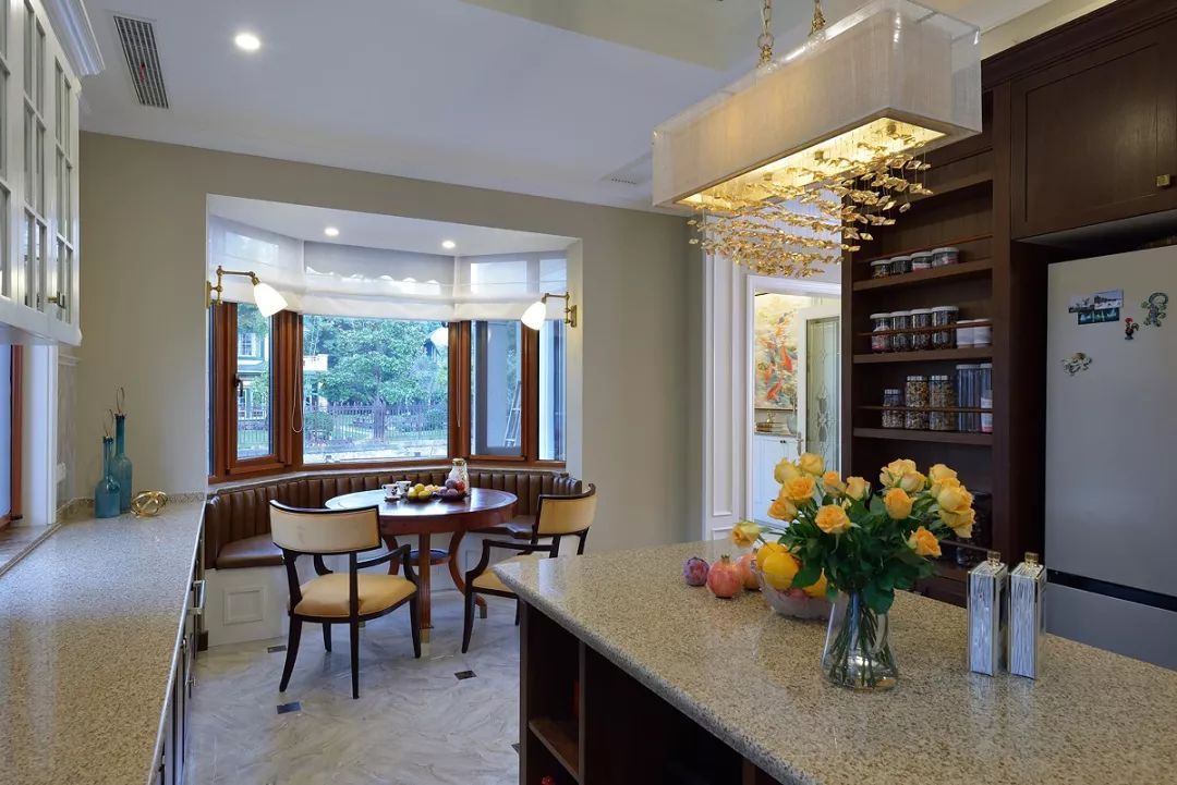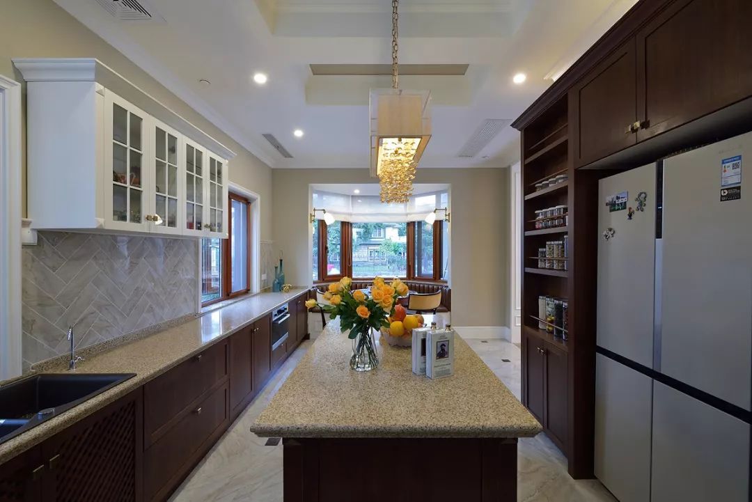 開放式廚房中西結(jié)合采光不屬于其他空間,中間的島臺(tái)即使會(huì)客也能從容應(yīng)對(duì),便美式的用餐習(xí)慣和社交形式,一家人的溫和與融合也能在房間功能上有提現(xiàn)。