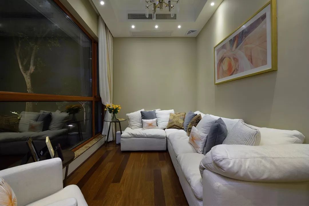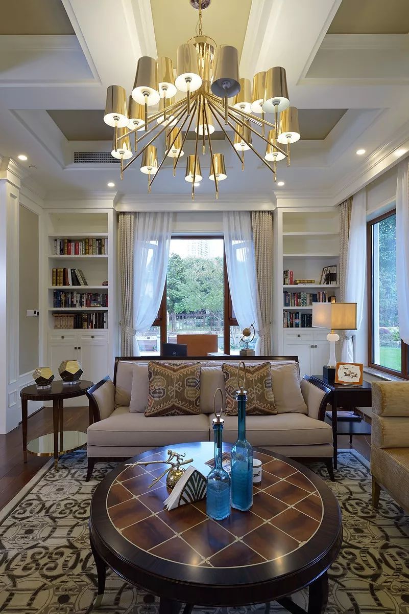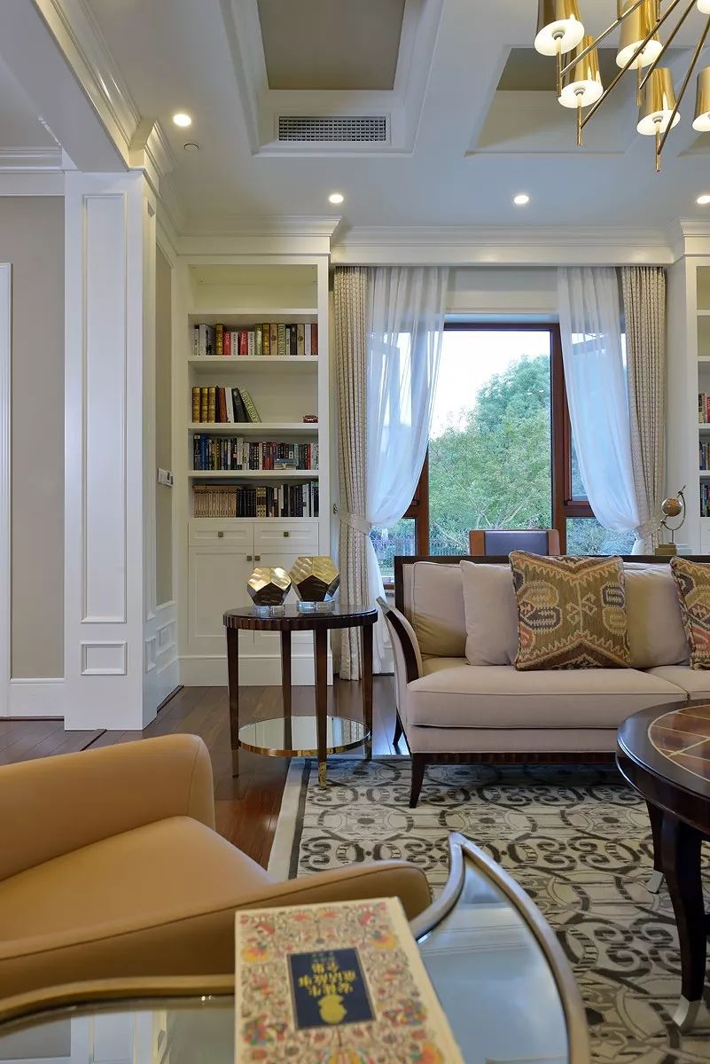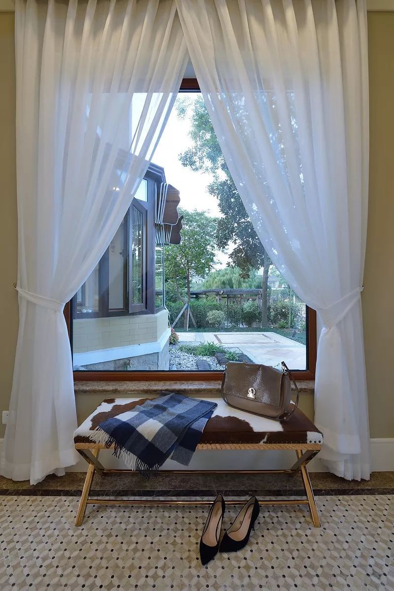 環(huán)形采光,優(yōu)越的挑高讓空間更顯雍容氣度。白色窗紗,米色窗簾,大氣溫馨,窗外遠(yuǎn)處翠色連綿,近處綠草如茵,一派貴族氣度,一腔柔情詩意。