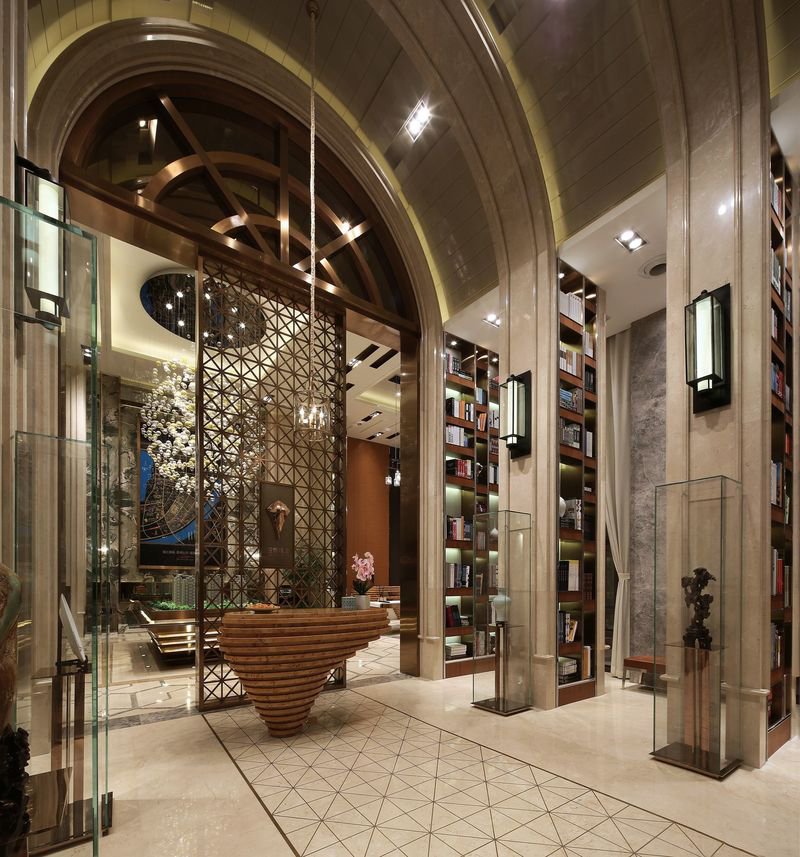 借鑒全球知名的“大英圖書館”中穹頂風(fēng)格,設(shè)計(jì)出濃郁風(fēng)情的書架,風(fēng)格奢華大氣而又不失雅致。英國圖書館是一座創(chuàng)造性、資源性、高效率的圖書館,采用這樣的設(shè)計(jì)不僅僅是為了體現(xiàn)外在的華美,更重要的是以此體現(xiàn)出學(xué)府所擁有的創(chuàng)造性、資源性的內(nèi)涵。