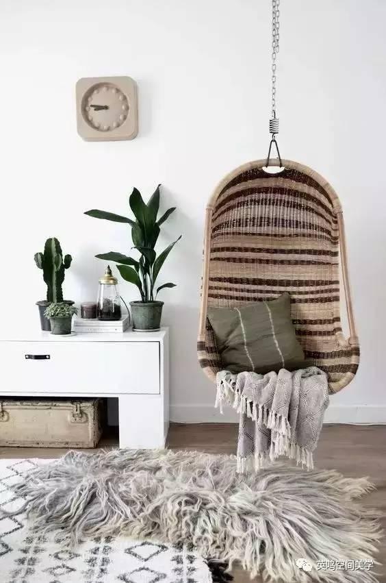 在軟裝陳設手法上,賦予情趣的空間場景是最直接的表達。像圖中的藤制秋千、陳舊的旅行箱、綠植盆栽巧妙地搭配在一起,非常的和諧自然,體現出一種閑趣,令人向往。