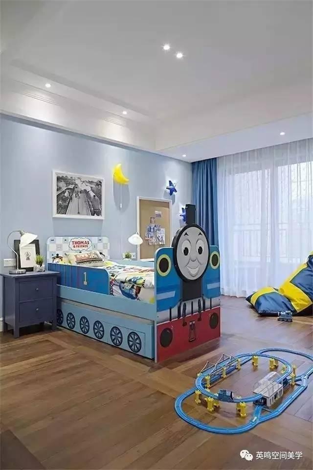 在做兒童房陳設時,往往以孩子的興趣點為導向。本案就以動漫形象“托馬斯小火車”為主題,打造了一個小男孩兒休息、玩耍的空間。