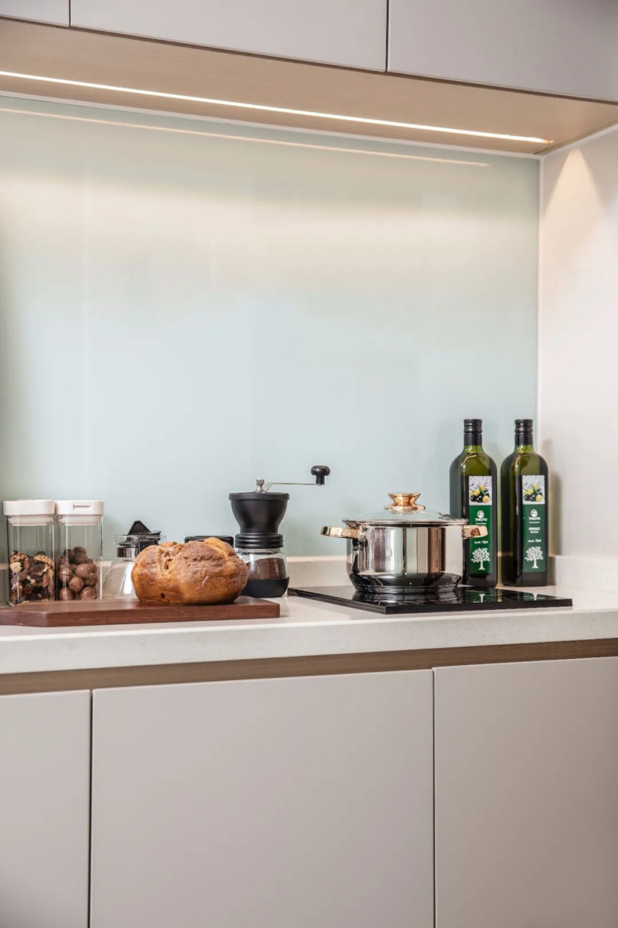 優(yōu)雅的灰色柜子與純真閃亮的白色臺面相結(jié)合,盡顯空間的精致高級感,內(nèi)嵌式燈飾更是烘托出廚房溫馨氣氛,不管多忙,都要吃個飯。