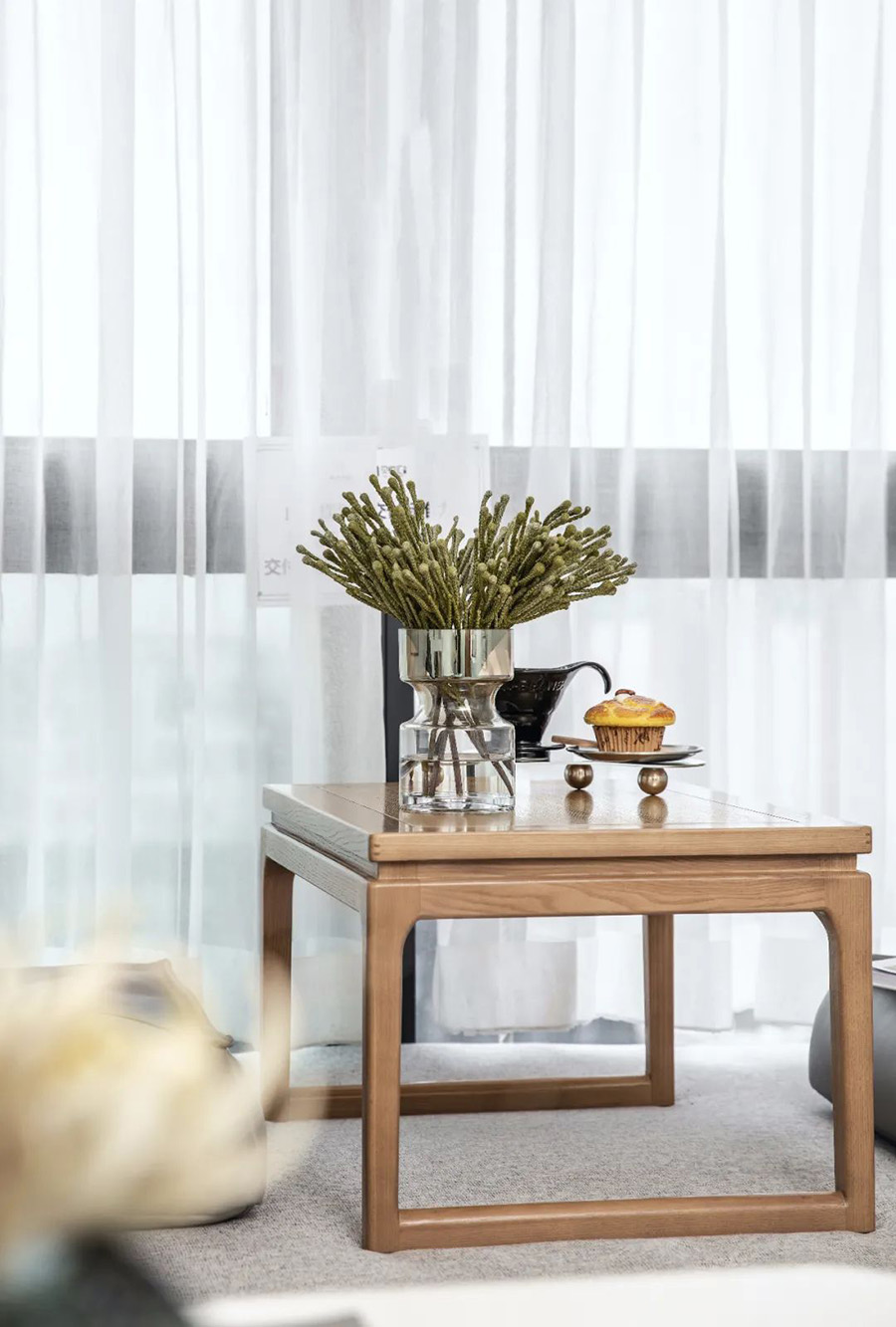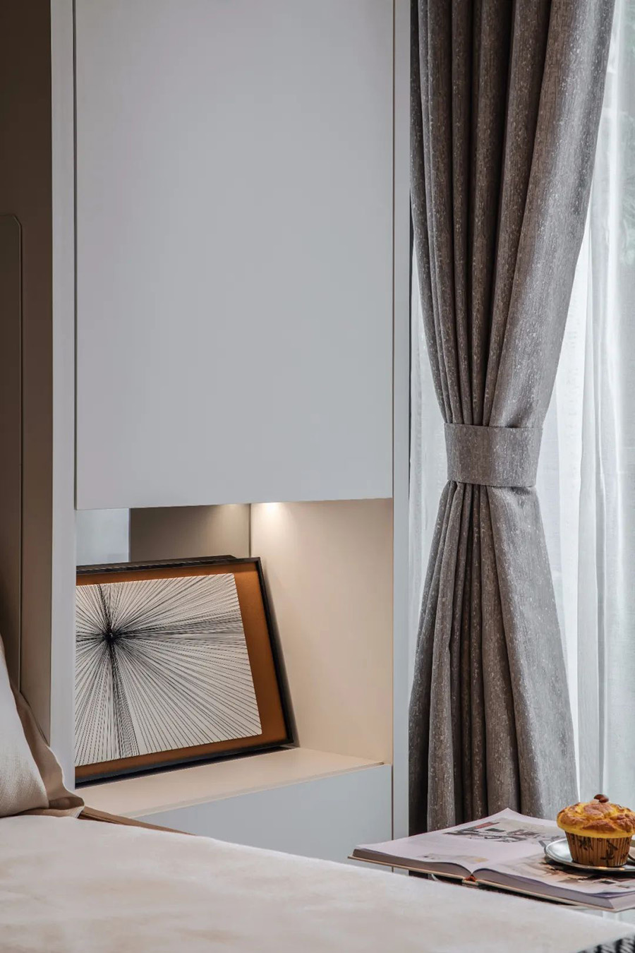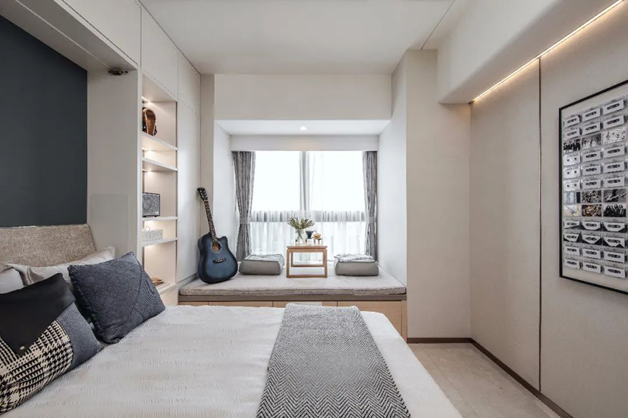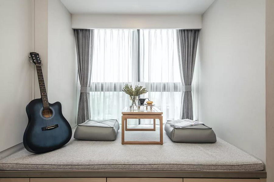 淺灰色的床墊,暖和的木質(zhì)桌子,小巧精致的玻璃花瓶,獨特的榻榻米飄窗,烘托出優(yōu)雅的空間氛圍。