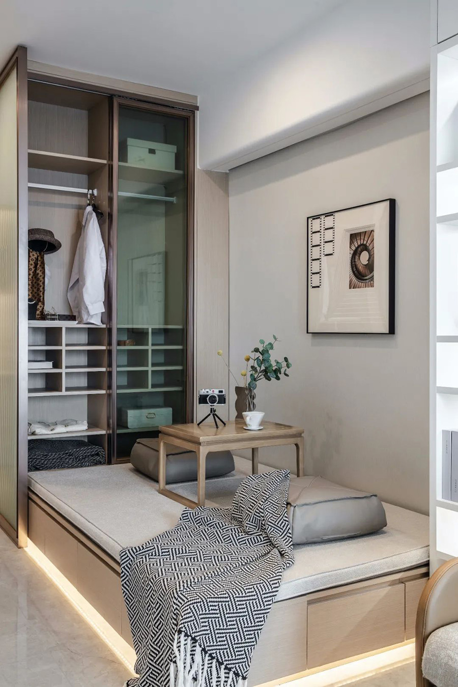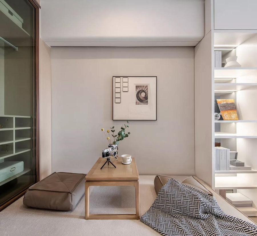 日式榻榻米臺面增加了空間的層次感,木色的小茶幾與深木色的玻璃衣櫥相互呼應(yīng),讓空間變得安靜,仿佛在喧囂的世界中有一方凈土。