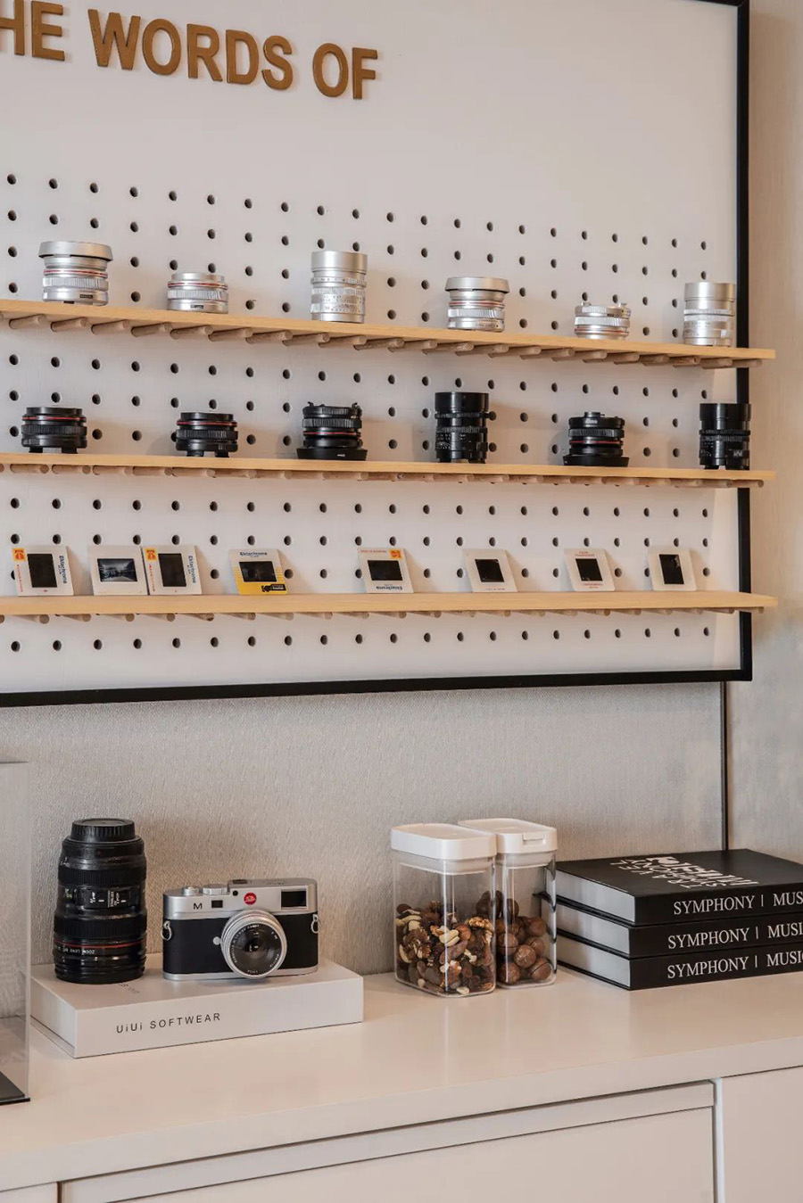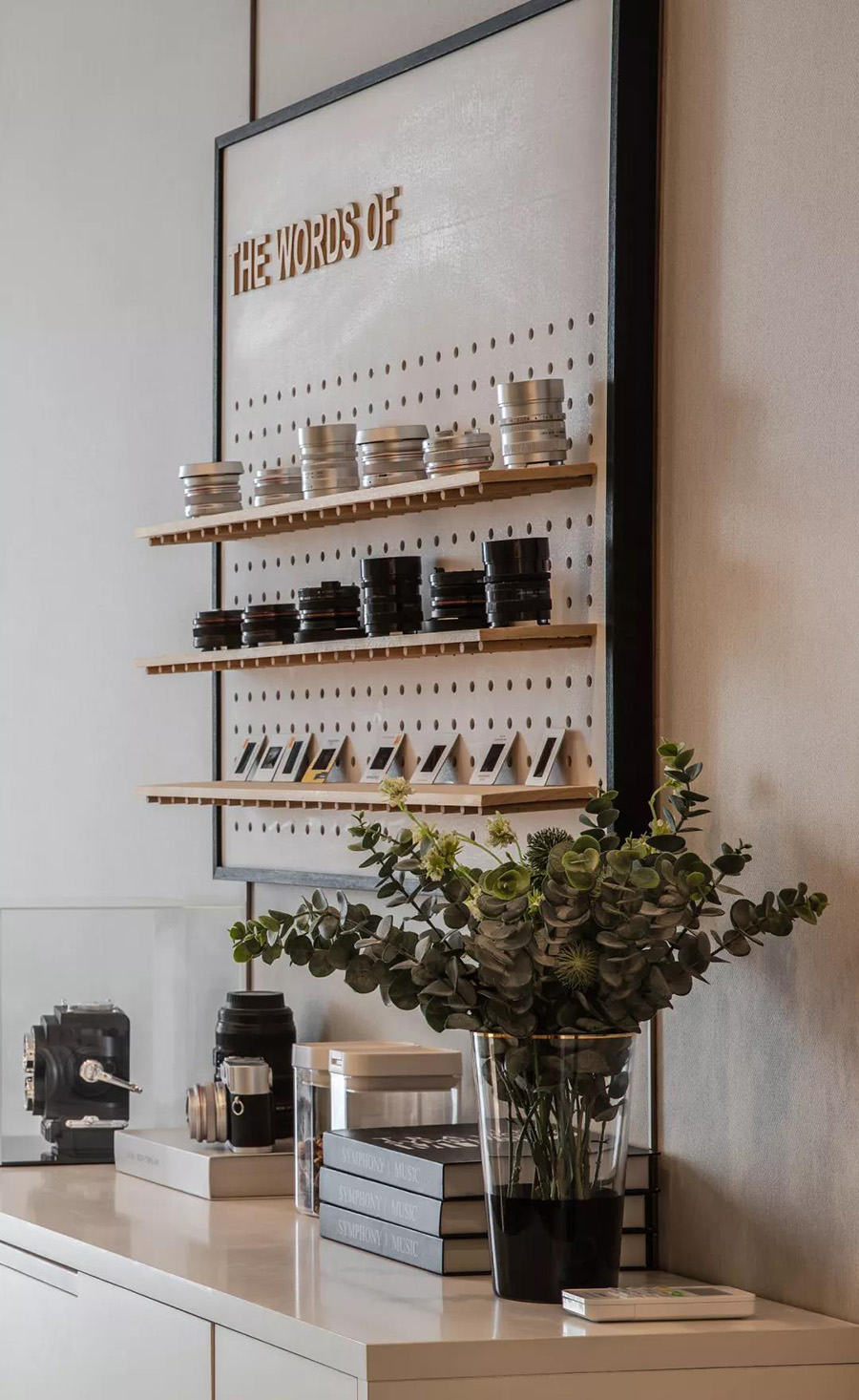 淺木書架上整齊排列的鏡頭,經(jīng)過精心裝裱的攝影作品,呈現(xiàn)出雅致空間的藝術(shù)氣息,這些看似不經(jīng)意的細節(jié),體現(xiàn)了設(shè)計者對都市人內(nèi)心的洞察力。