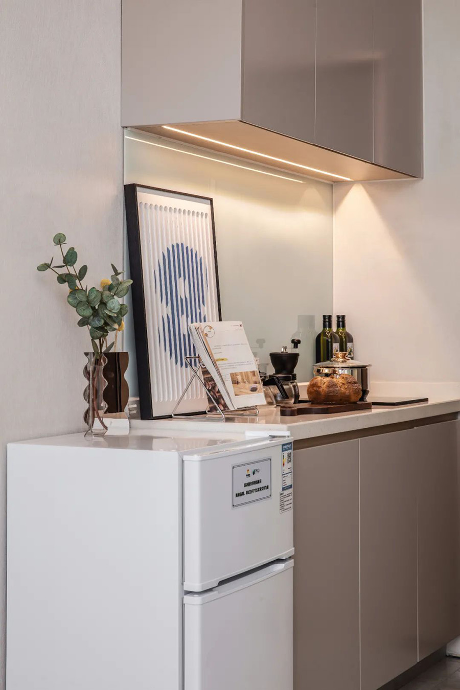 這間廚房主色調(diào)為啞光白,不同材質(zhì)的淺灰色調(diào)板構(gòu)成了櫥柜,天藍灰的作品突出了空間的藝術(shù)氣息,更加突出了房間的品位。