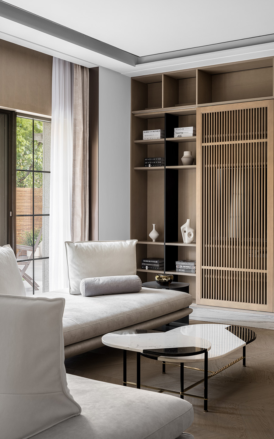 設計者考慮保留原有建筑窗子的位置,巧妙地運用木飾面分割,利用格子透光不透景,營造出靜謐空間。