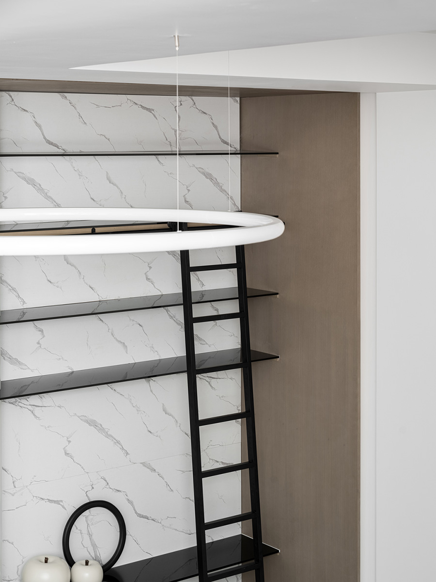 墨水紋理的石材櫥柜面與地面呼應,布料黑白相間,讓經(jīng)典的空間時尚而又充滿東方氣息。