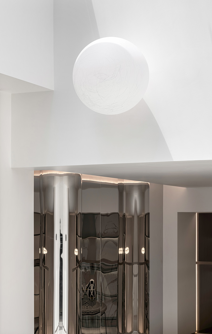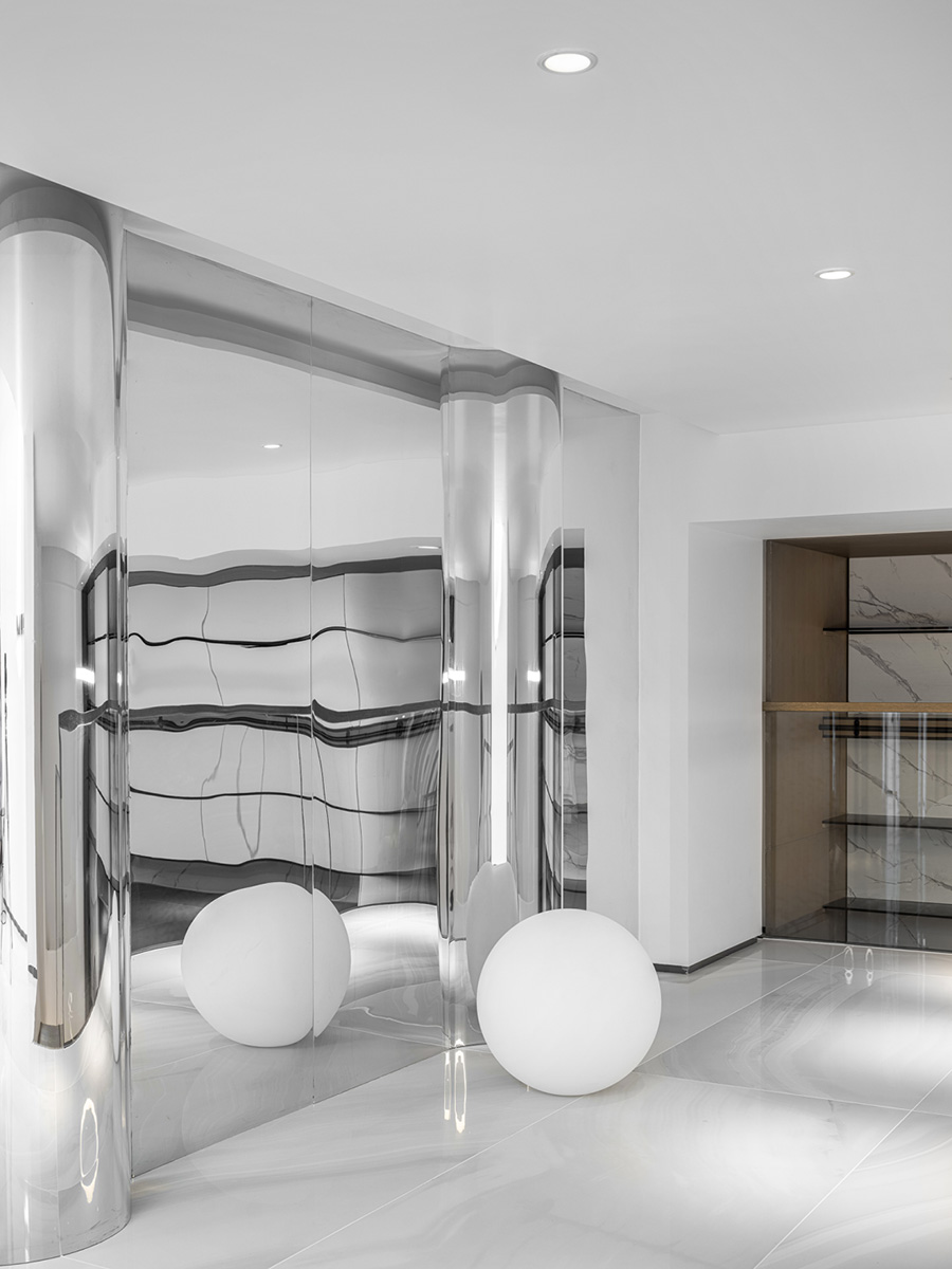 球狀吊燈與方型空間、弧形頂部和扭曲的立面,構(gòu)成了空間的點線面關系和平面立面的空間變化性和視覺感,以延展的線形燈光勾勒出空間的輪廓感。扭轉(zhuǎn)鏡不銹鋼反射出空間實體和虛體之間的存在關系,使空間得以延伸和延伸。