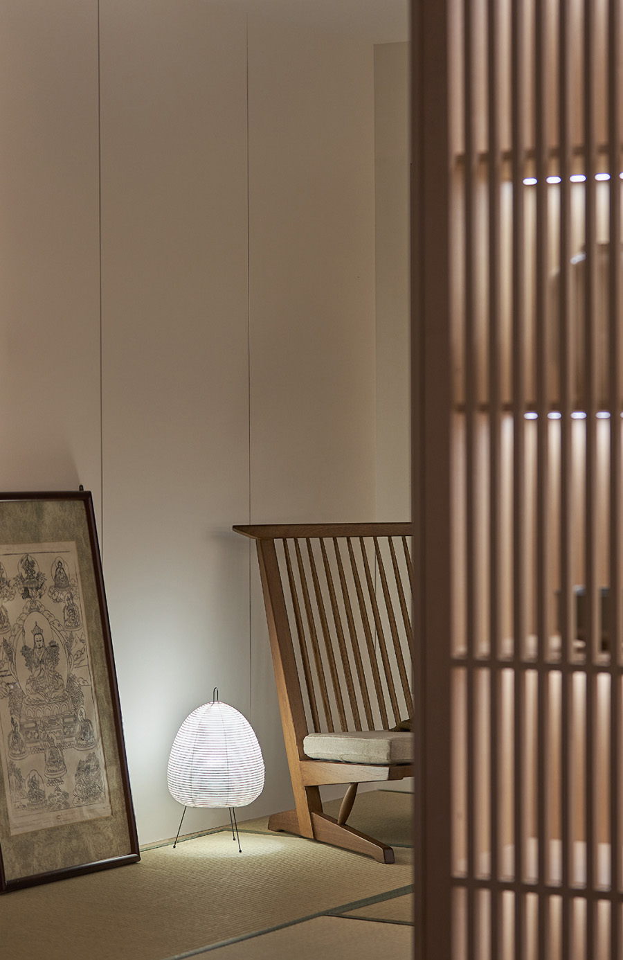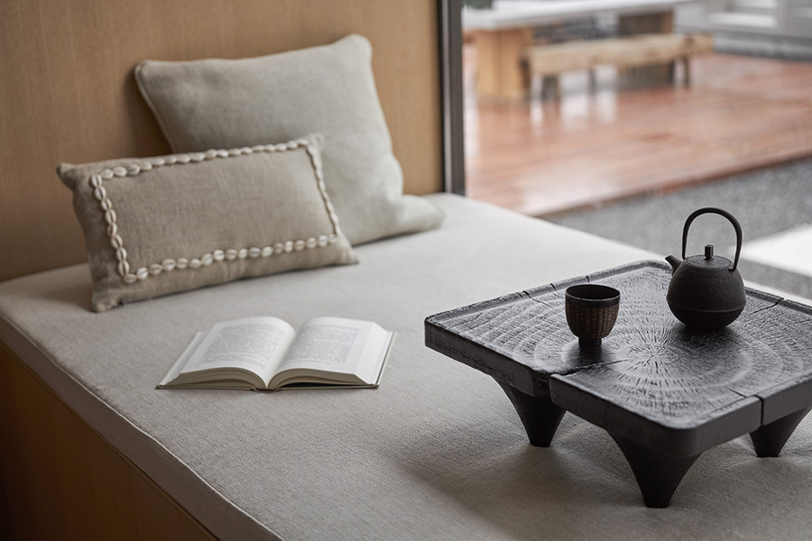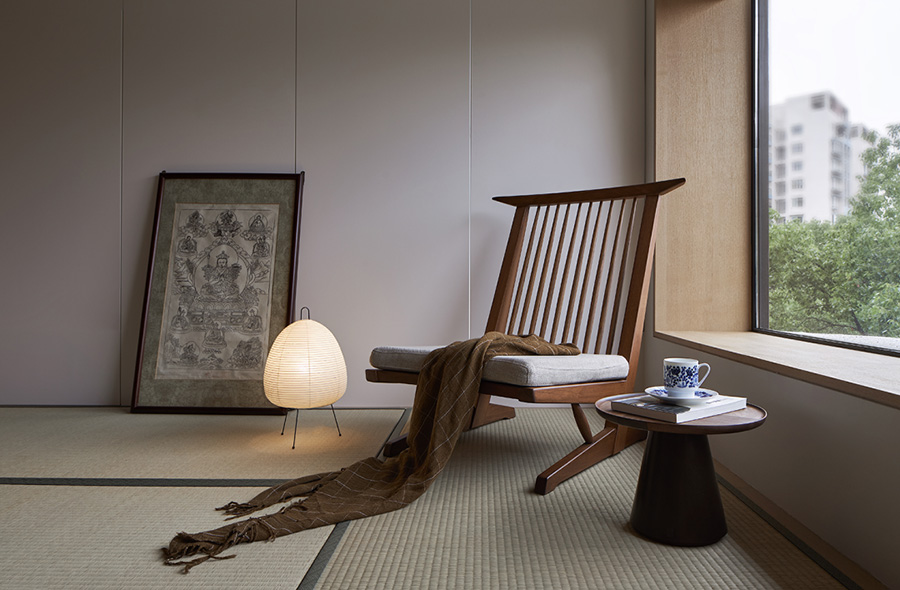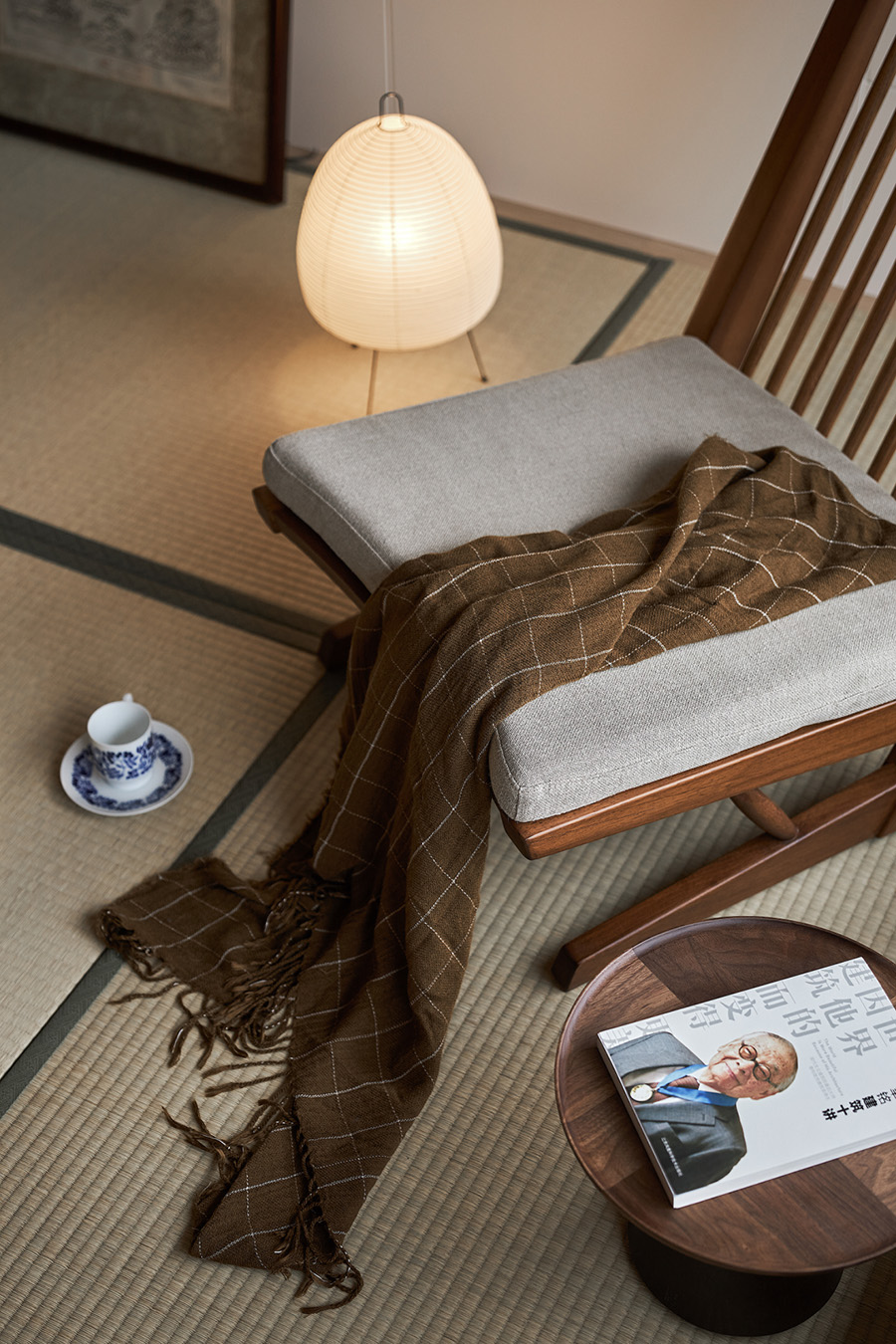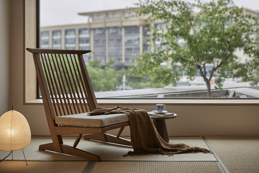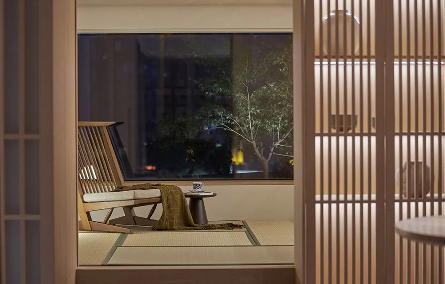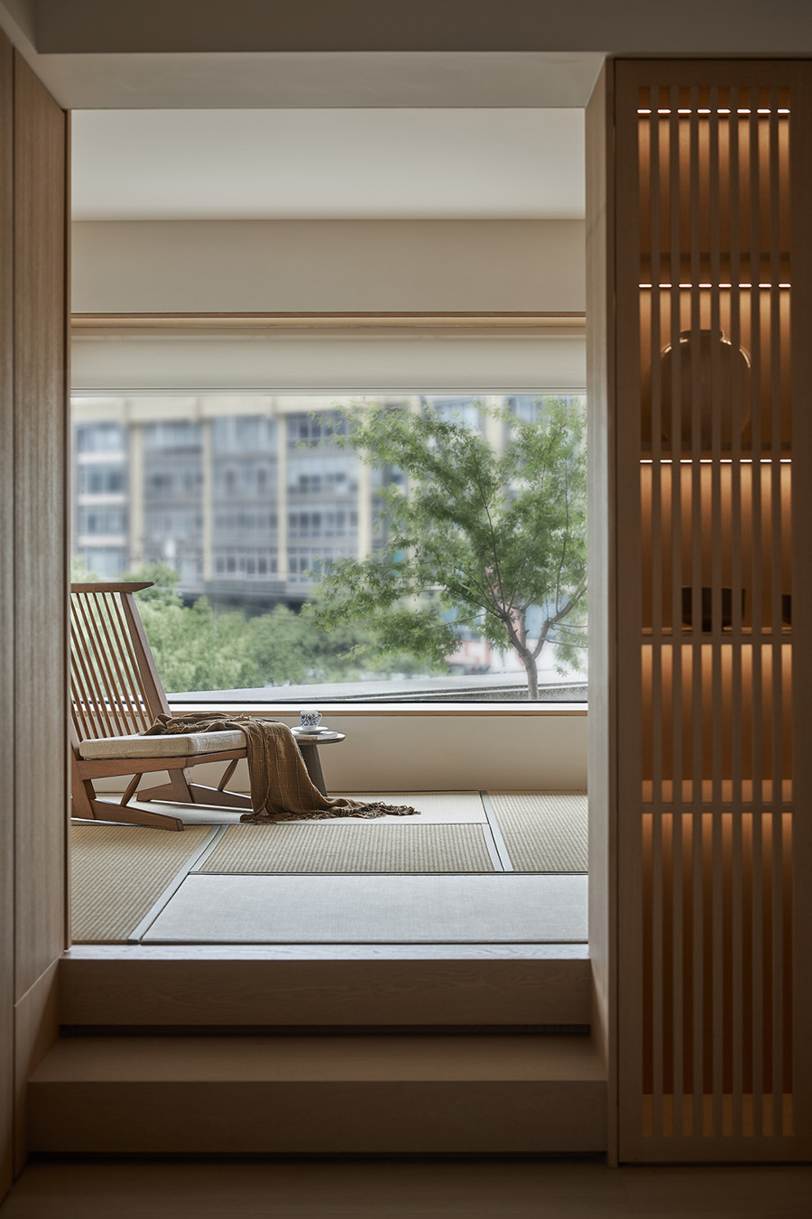 與這種禪意不謀而合的是凸窗外的微縮園林——枯山水——以層層蕩漾的白沙為水,以石為山,輔以綠色盆景,默默成為自己的世界。