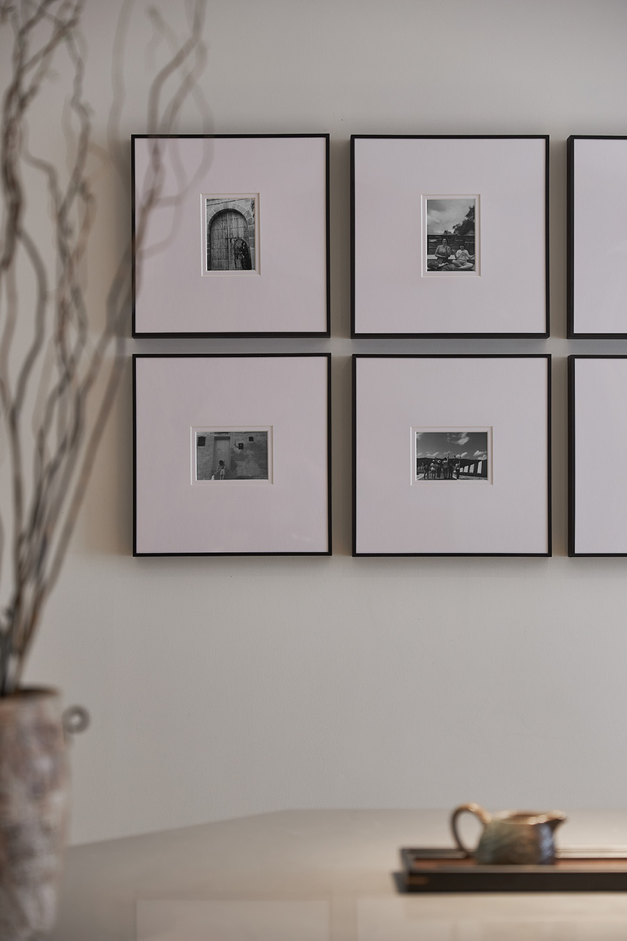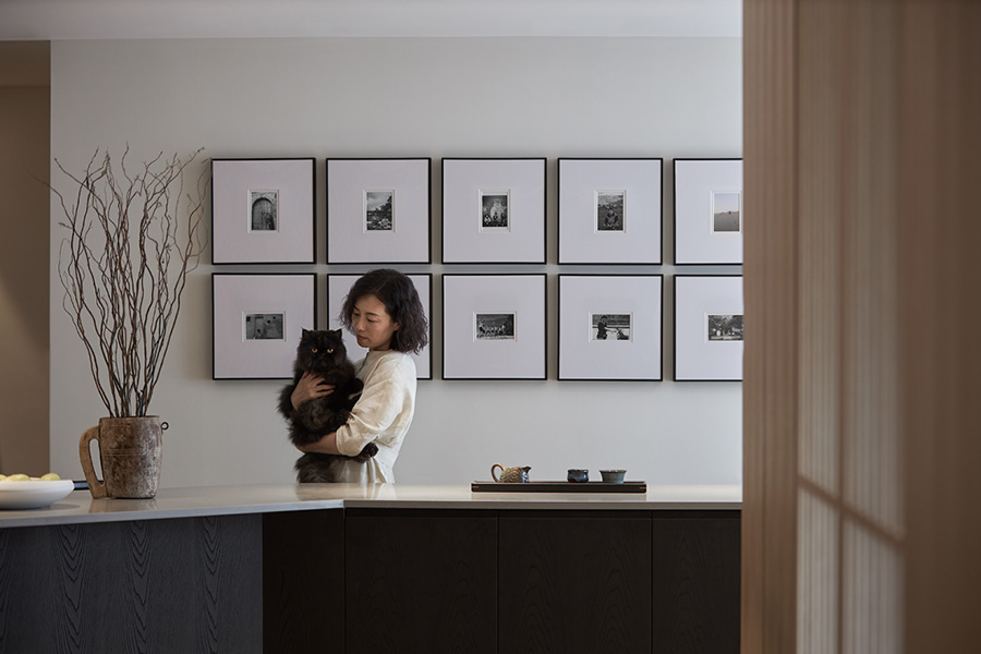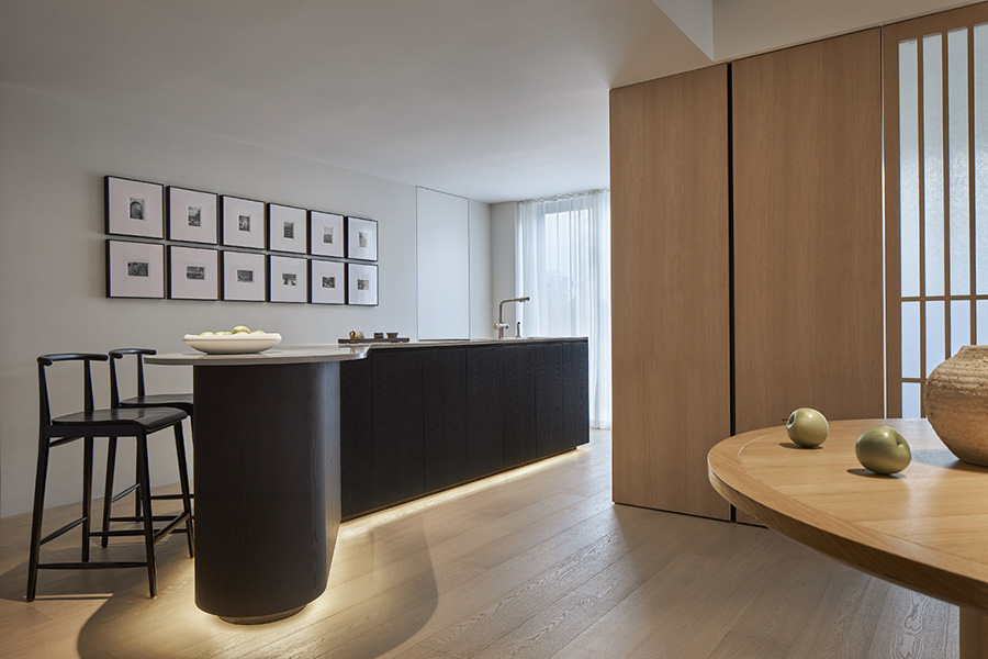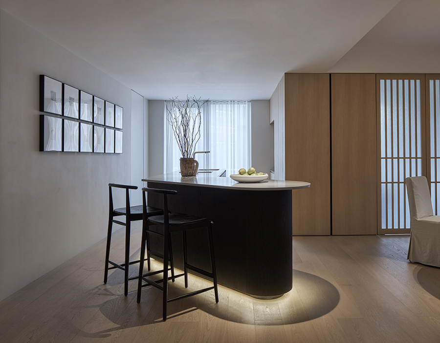 穿過玄關(guān),島臺映入眼簾。深黑色的裝飾有一抹寧靜的灰色。臺面上的裝飾擺件讓單調(diào)的灰色俏皮靈動,與墻面的留白墻掛相映成趣。島臺作為使用頻率較高的區(qū)域,設(shè)置在前后院動線之間。