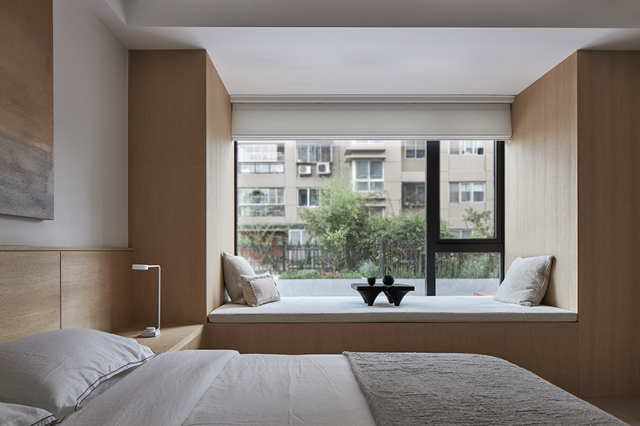 書房藏在門后,將窗外的風景引入室內(nèi),在坐臥之間欣賞外面的風景,享受無他之靜
