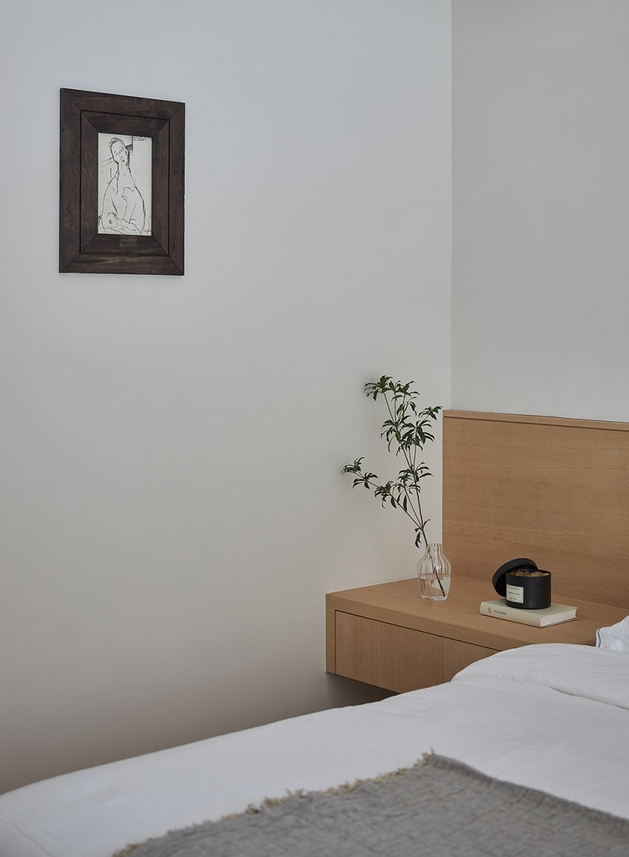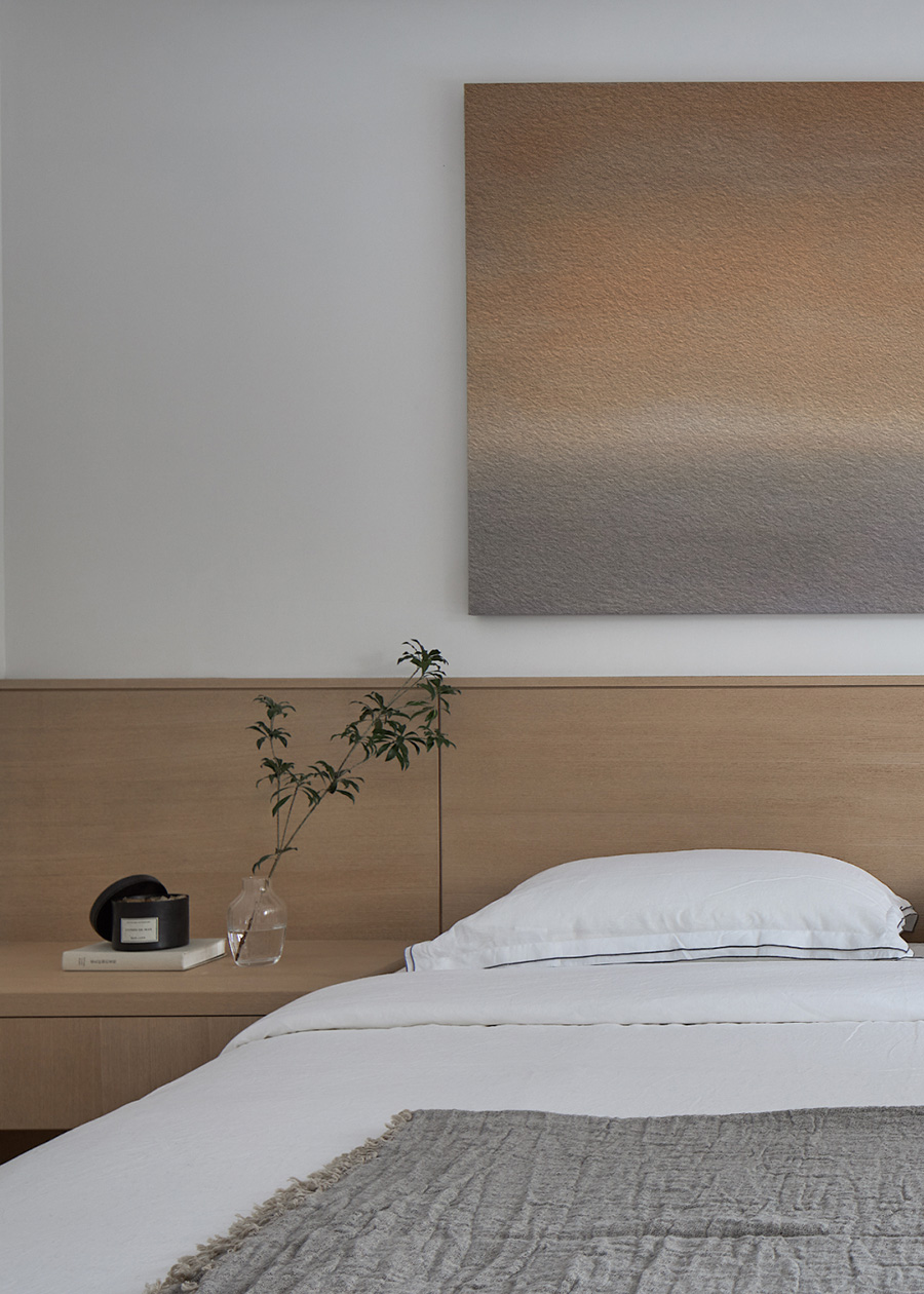臥室作為具有休息功能的臥室,延續(xù)了客廳舒適營造的自然尷尬。床頭的漸變裝飾為空間增添了一抹亮色。而且它與臥室配色的融合與對應(yīng),更加禪意。仿佛在這里品茶的不再是茶,而是靜靜地沿著喉腔滋潤身心的時光。就像生活本身一樣,從不在別處,也不需要刻意向外尋求,在這個世界之間。