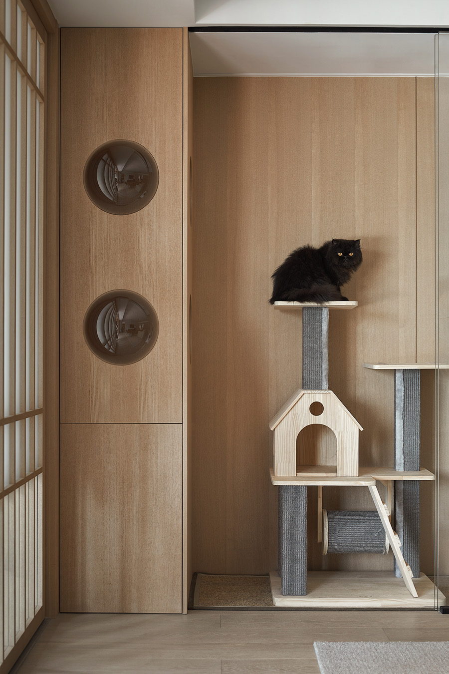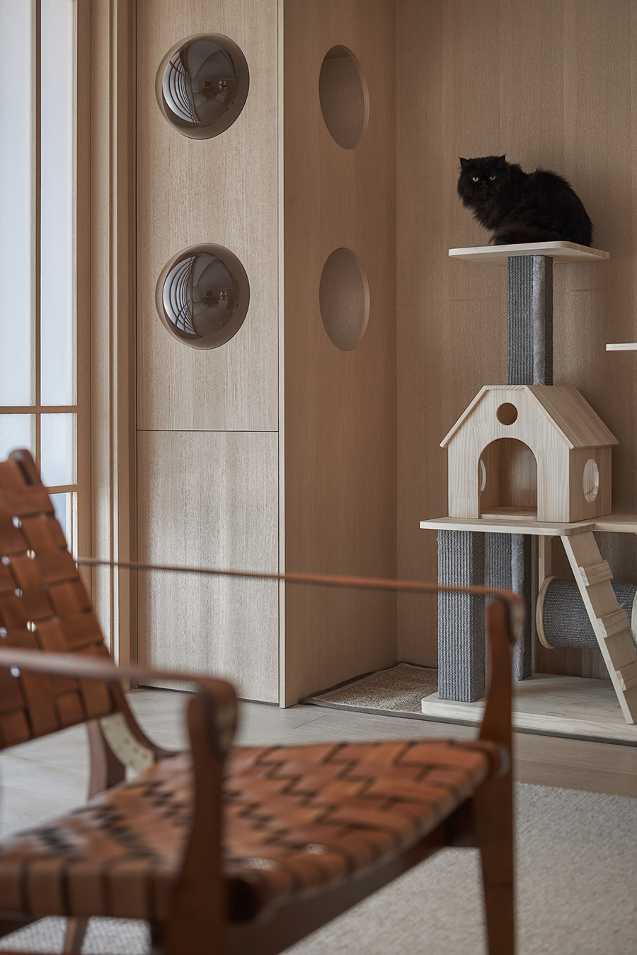 輕輕轉(zhuǎn)身,與意想不到的溫柔碰撞,大量的木質(zhì)背景,以其真實的姿態(tài),給客廳空間自然而富有質(zhì)感的背景色。棉麻沙發(fā)不僅提高了空間舒適度,還營造出一種寂靜的感覺。結(jié)合有趣的貓爬架,鬧中取靜的悠閑意境呼之欲出。
