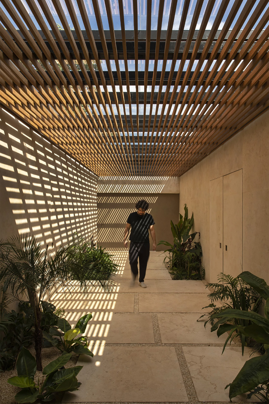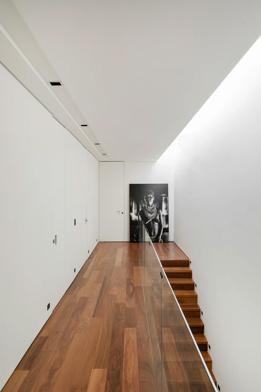 為使功能劃分更加明確,建筑師將住宅分成三個部分:靜區(qū)(臥室)、活動區(qū)(客廳、餐廳、廚房)和庭院。走進住宅,由簡約的現(xiàn)代大門即是充滿自然氣息的光廊,讓人進入寧靜的氛圍,兩邊種滿綠植,讓室內(nèi)自然愜意。