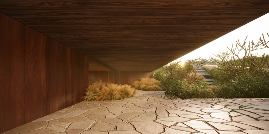 它是一座純粹的極簡建筑,可自然開啟的旋轉(zhuǎn)門,構(gòu)成建筑中最重要的開敞元素,也創(chuàng)造出朦朧的建筑藝術(shù)。在“大地色”的基調(diào)下,融合了木材等溫潤、天然石材的粗獷與質(zhì)樸,混凝土的莊嚴,野性十足的景觀設(shè)計等元素,營造建筑與自然的和諧美。
