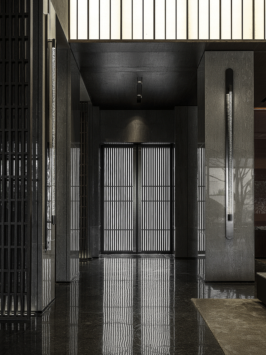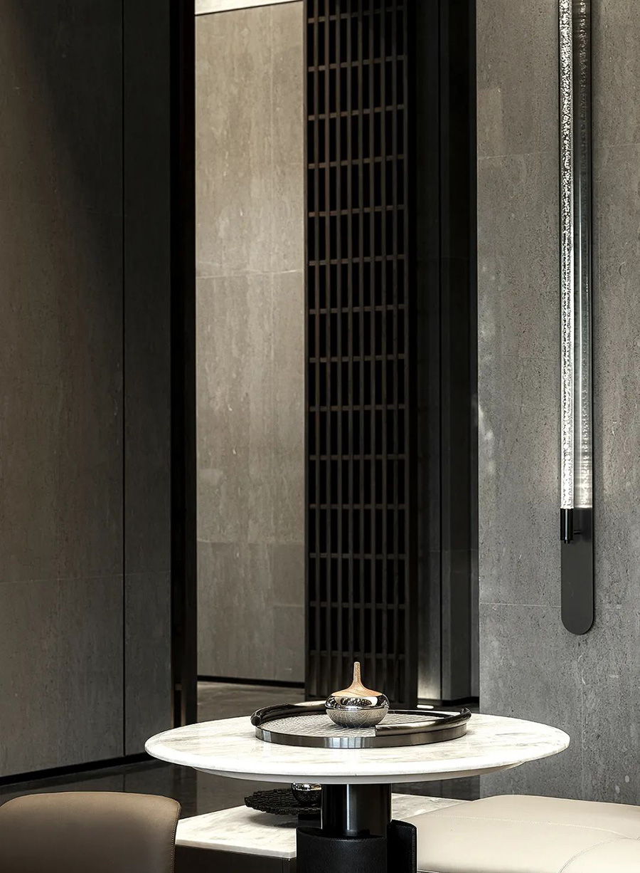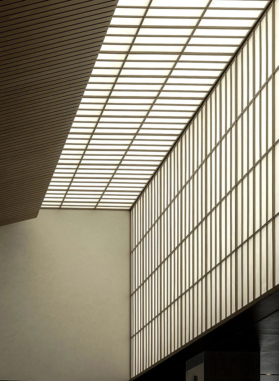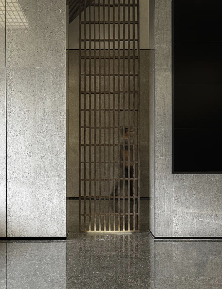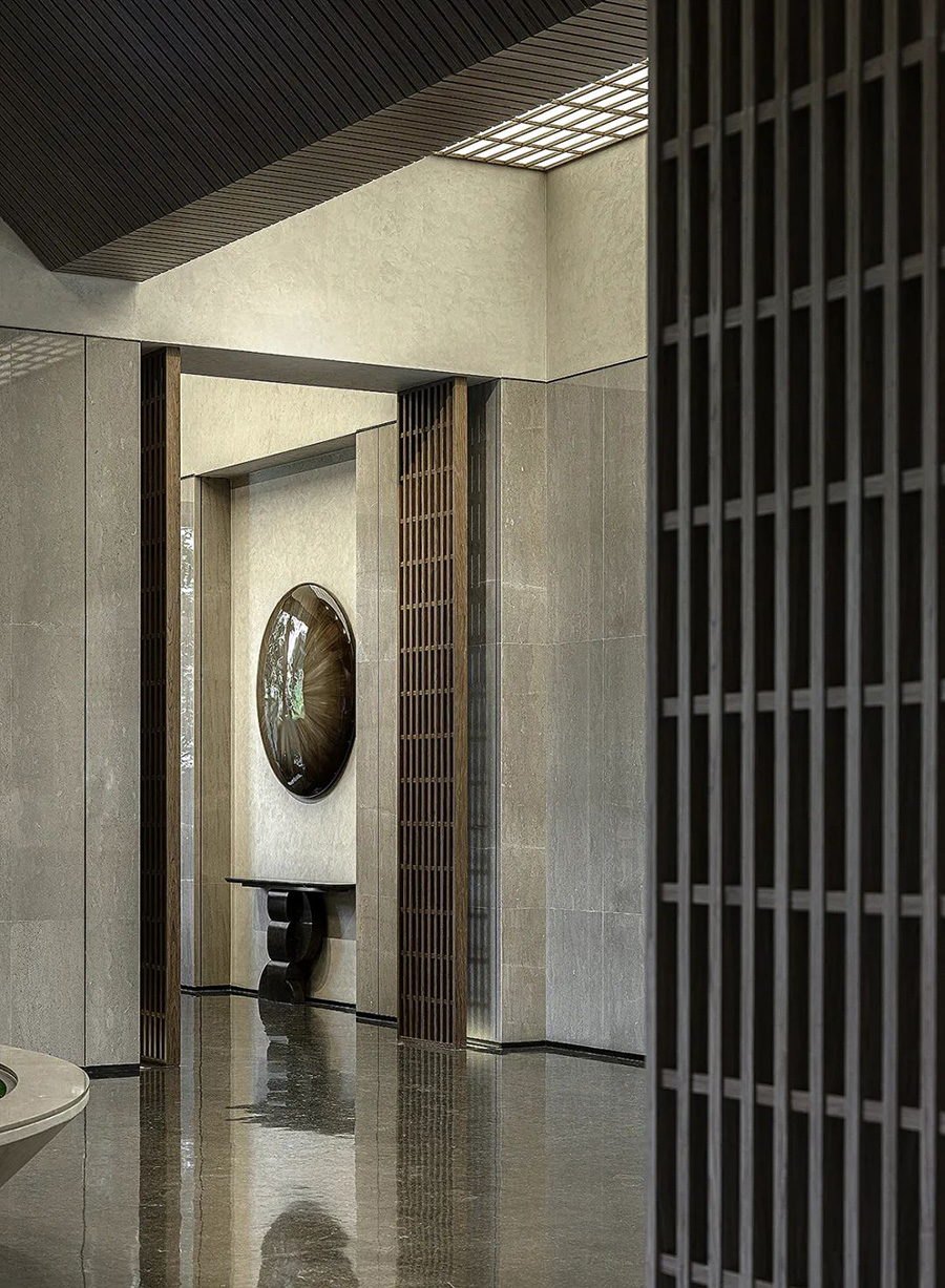 走進(jìn)前廳,一段回溯的旅程就此開始。來襲的斜坡孕育著莊重莊重的氣勢,強化了空間的縱深和體感,顯示出東方秩序的力量。