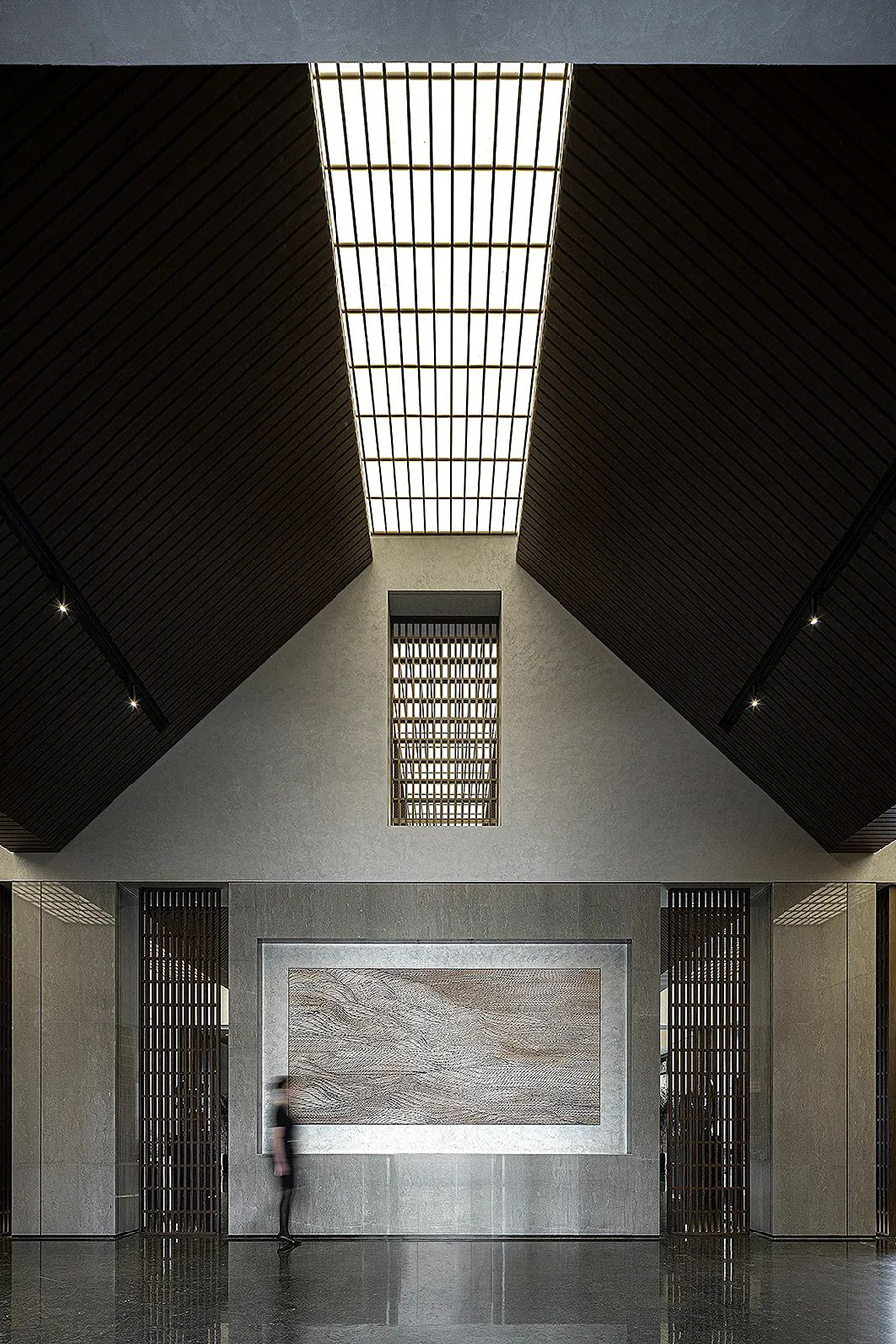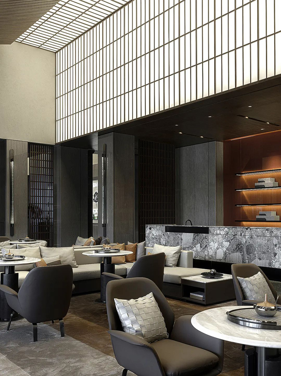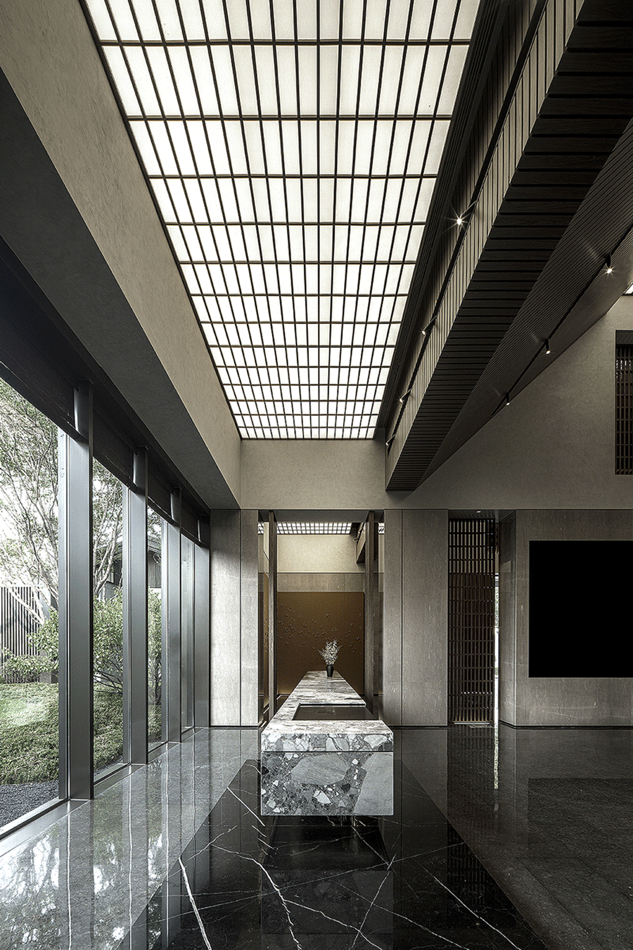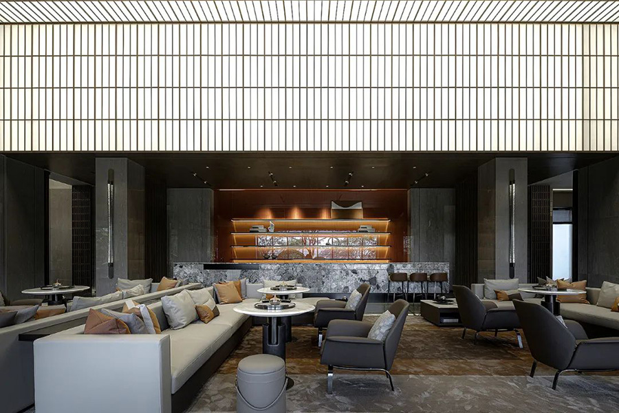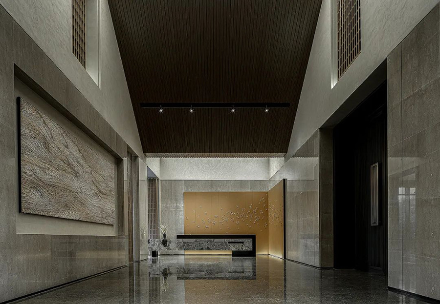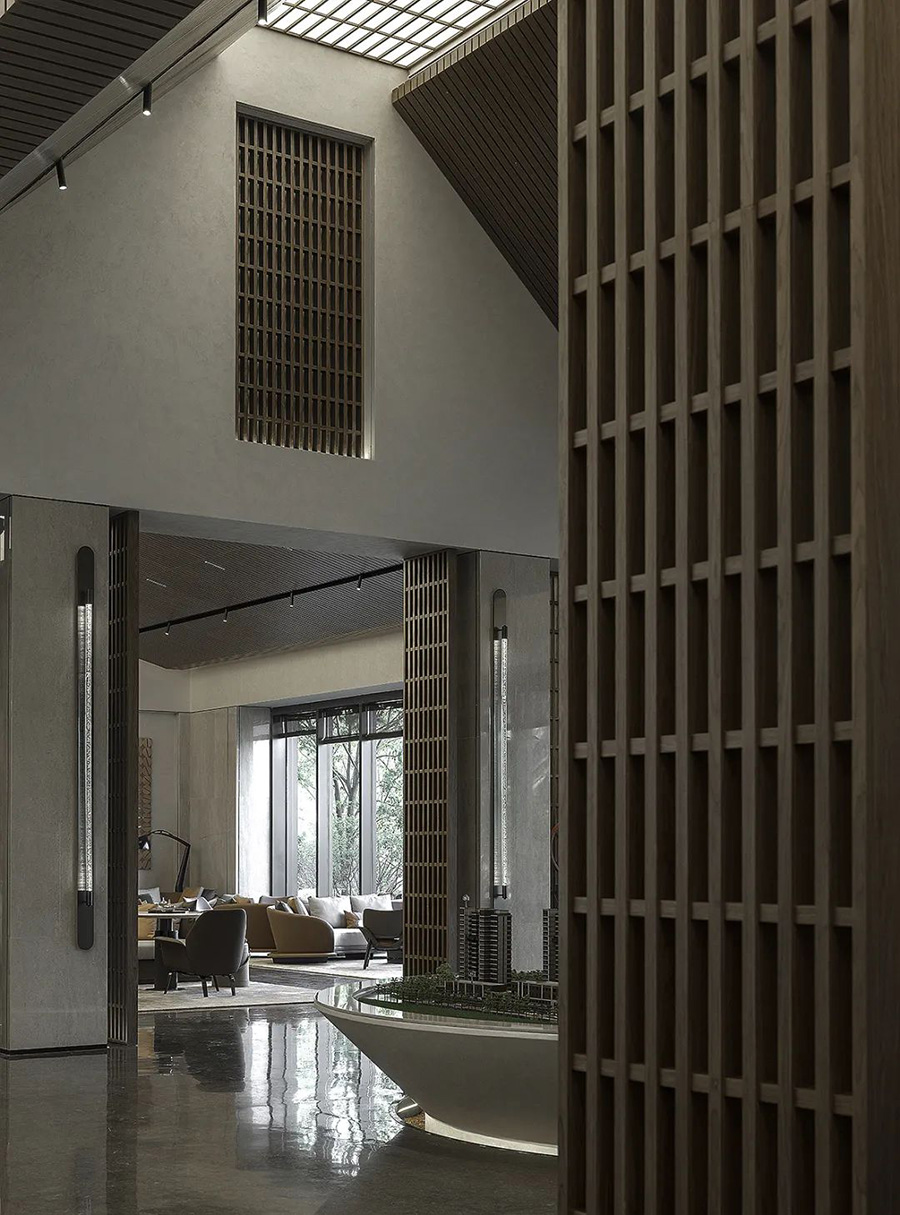 走進(jìn)前廳,一段回溯的旅程就此開始。來襲的斜坡孕育著莊重莊重的氣勢,強化了空間的縱深和體感,顯示出東方秩序的力量。