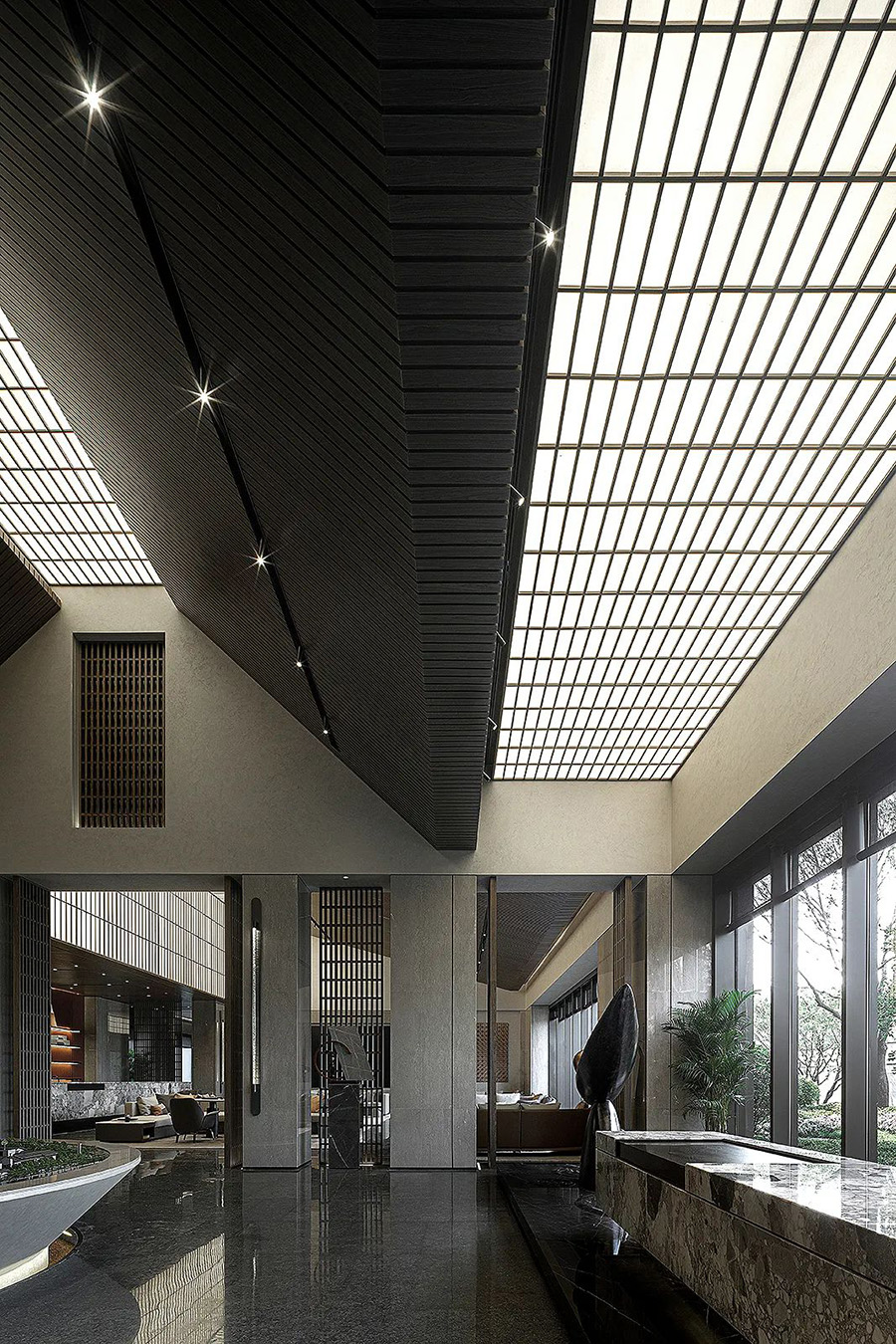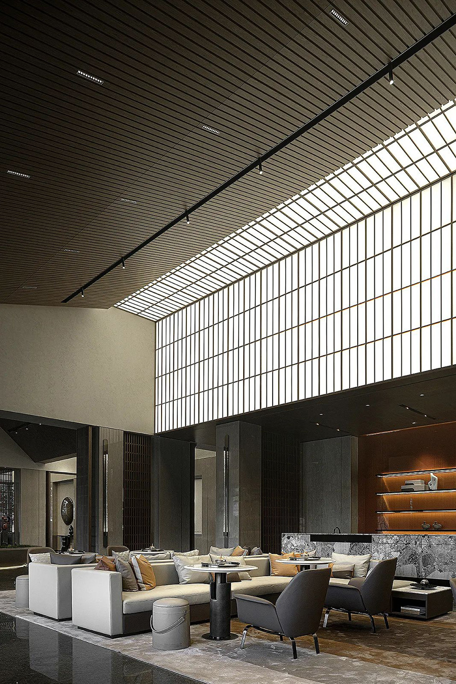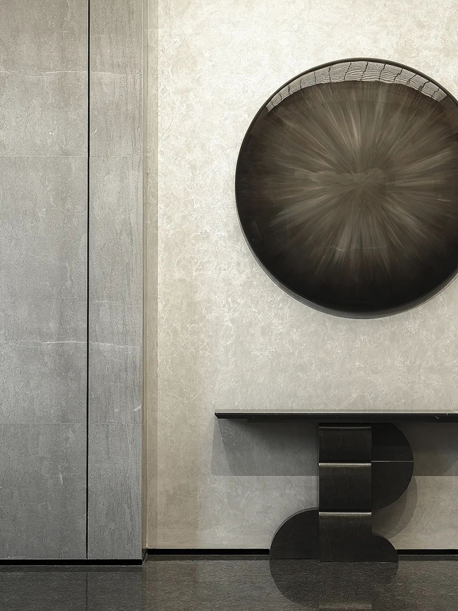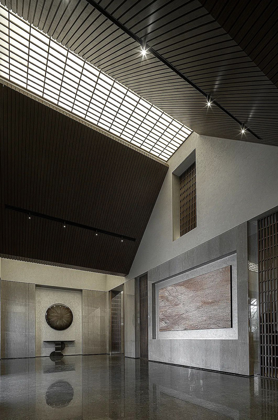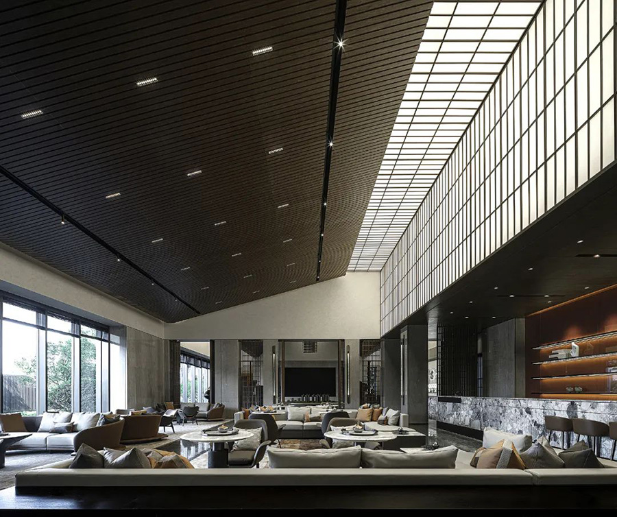 走進(jìn)前廳,一段回溯的旅程就此開始。來襲的斜坡孕育著莊重莊重的氣勢,強化了空間的縱深和體感,顯示出東方秩序的力量。