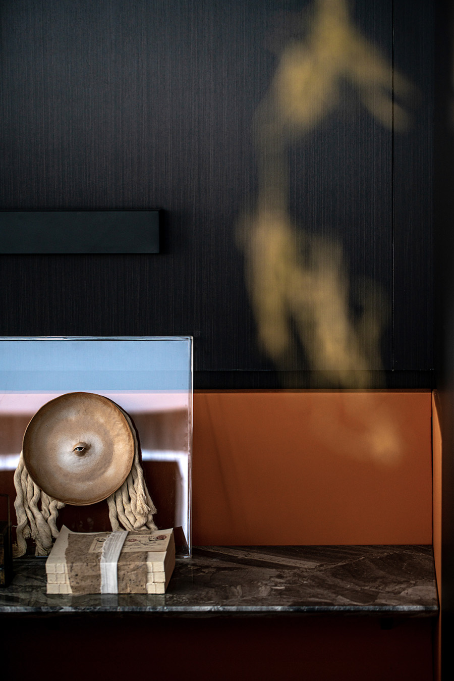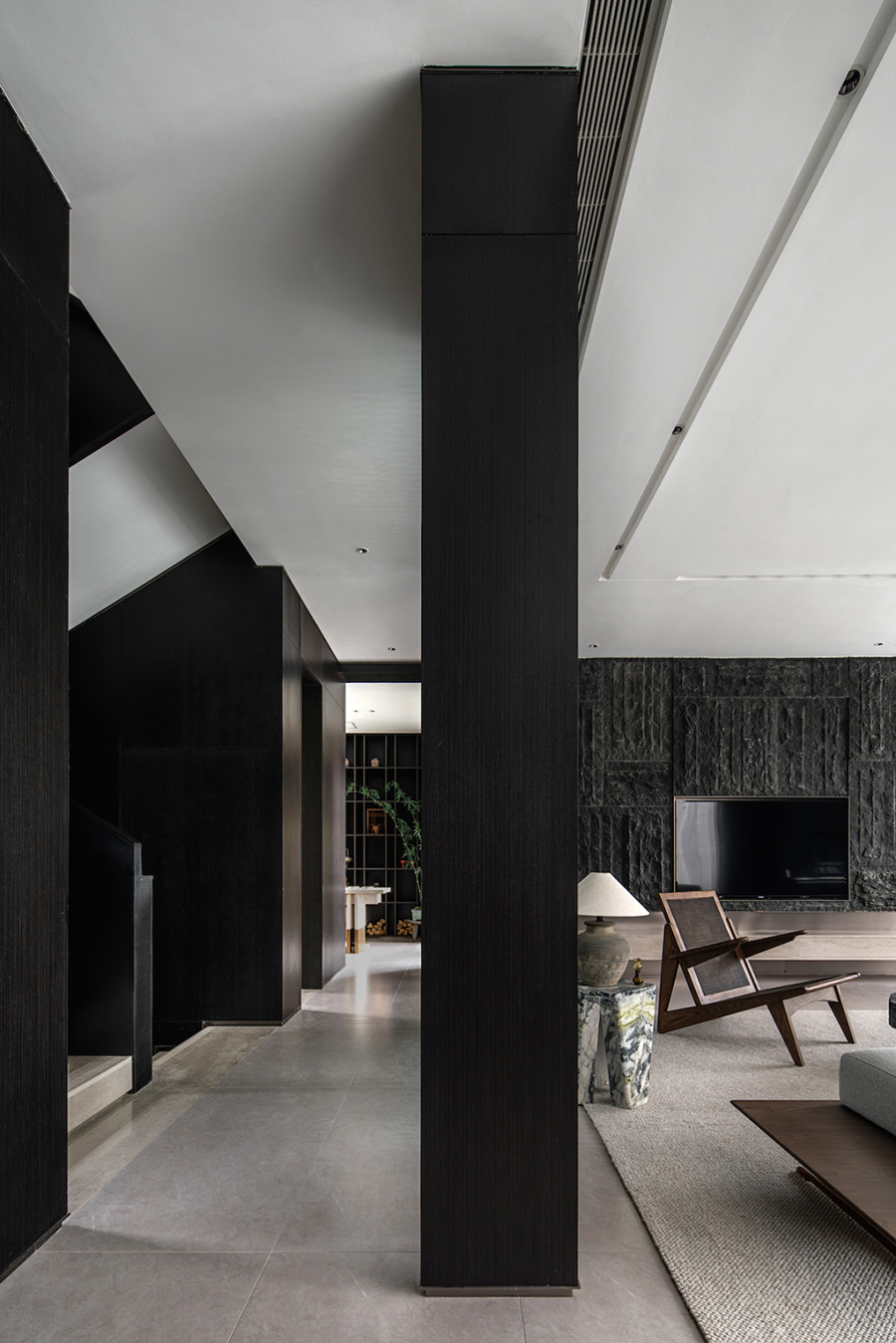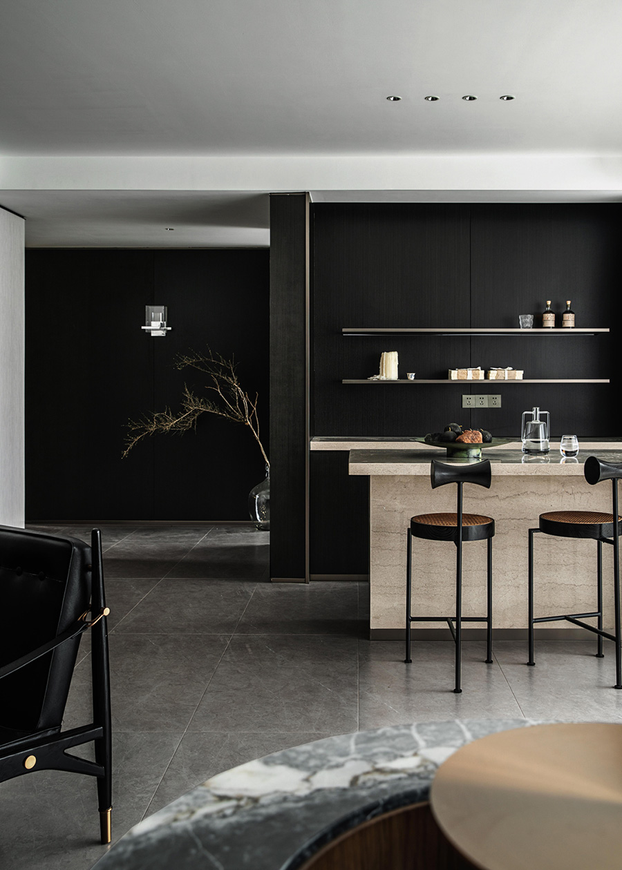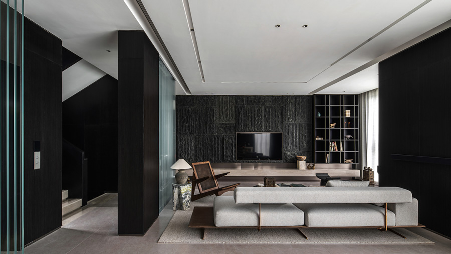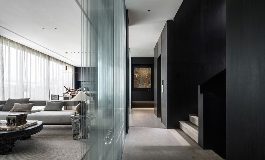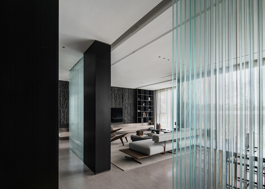 人類穿越空間的過程,本身就是一種漫游,氣氛激發(fā)想象,有限度地由沉浸式引導(dǎo)通感,然后通過空間重構(gòu)喚醒身體和感覺的感知。起居室內(nèi)玻璃的輕盈與石材的厚重感形成視覺上的對(duì)撞,粗糙和光滑之間的摩擦,和傳統(tǒng)園林中關(guān)于“石壁”和“瀑布”的直覺和想象。