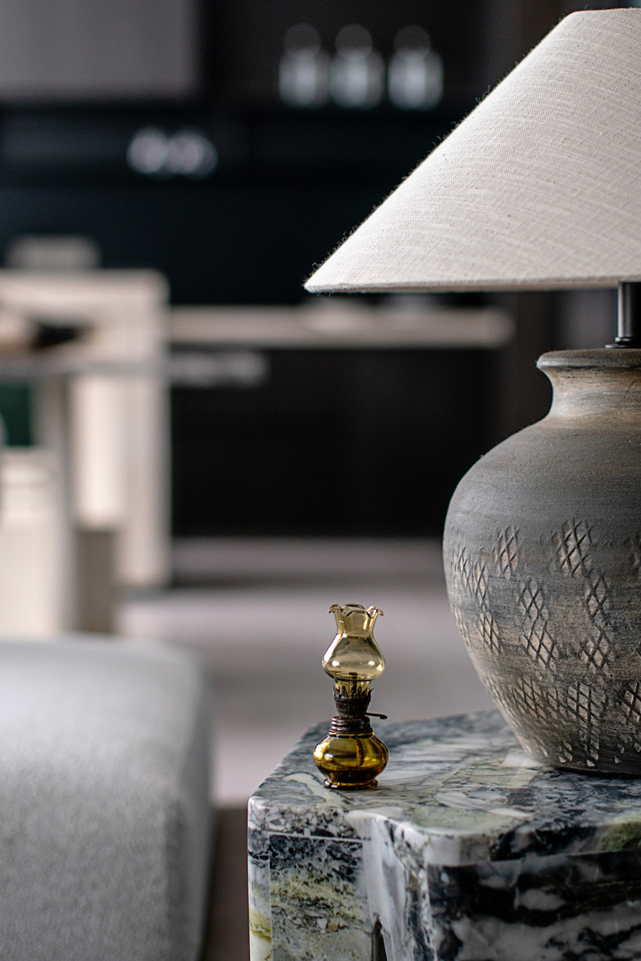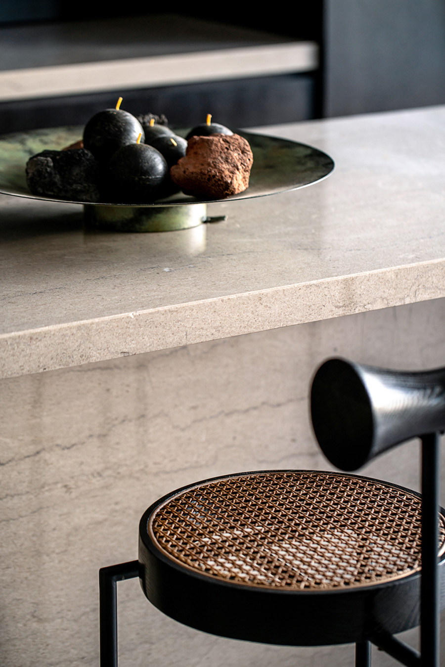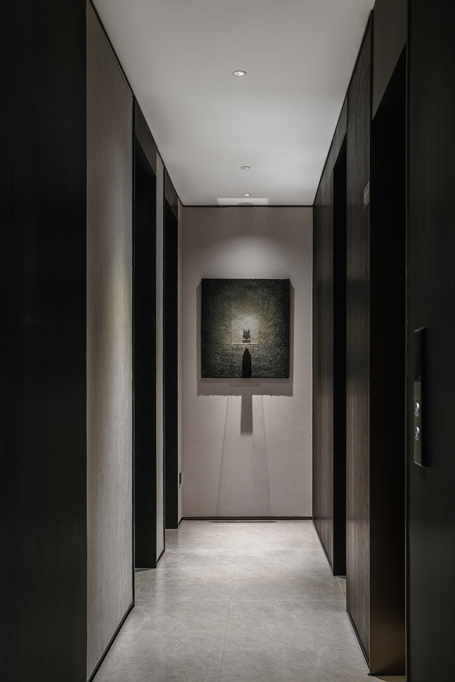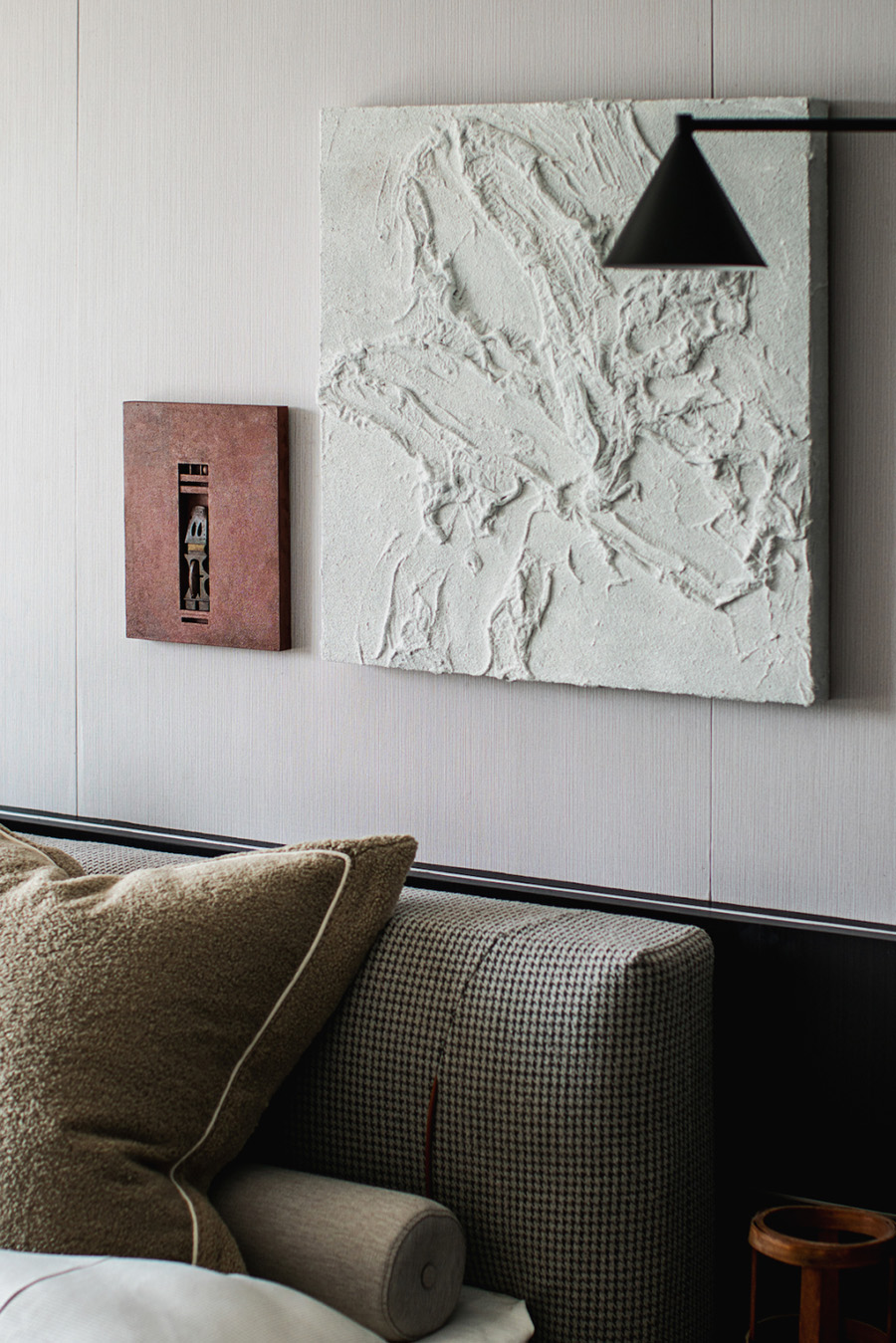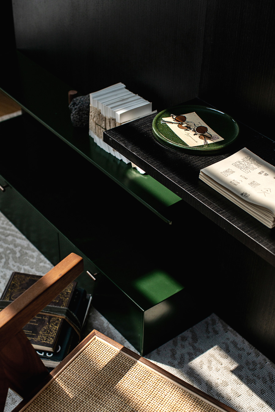 人類穿越空間的過程,本身就是一種漫游,氣氛激發(fā)想象,有限度地由沉浸式引導(dǎo)通感,然后通過空間重構(gòu)喚醒身體和感覺的感知。起居室內(nèi)玻璃的輕盈與石材的厚重感形成視覺上的對(duì)撞,粗糙和光滑之間的摩擦,和傳統(tǒng)園林中關(guān)于“石壁”和“瀑布”的直覺和想象。