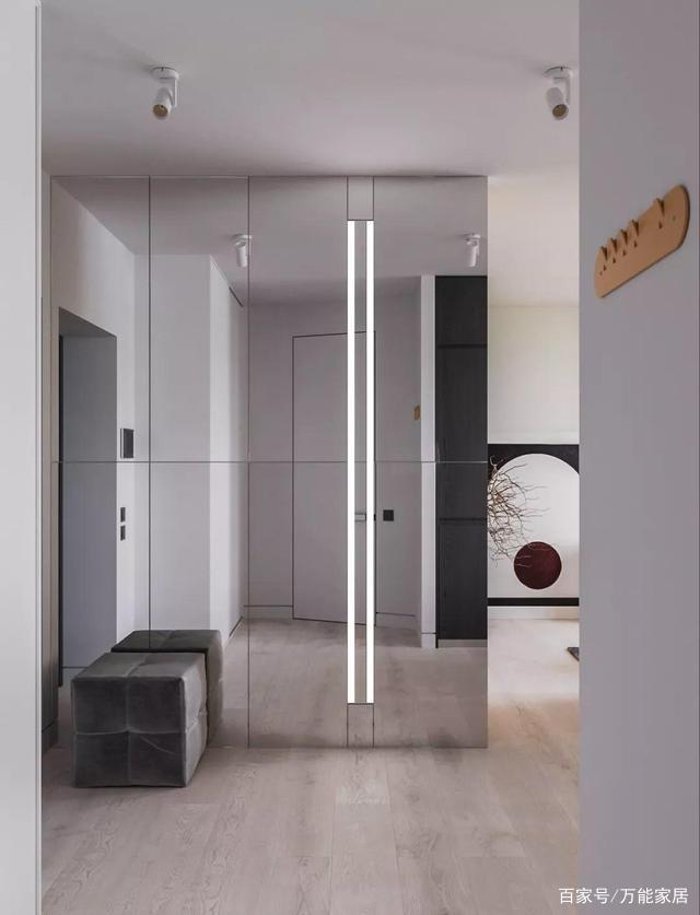 玄關(guān)處整體墻面、天花板采用白色為主色調(diào),讓小空間更顯通透明亮,鏡面柜門設(shè)計(jì)也在視覺上起到擴(kuò)充空間的效果。