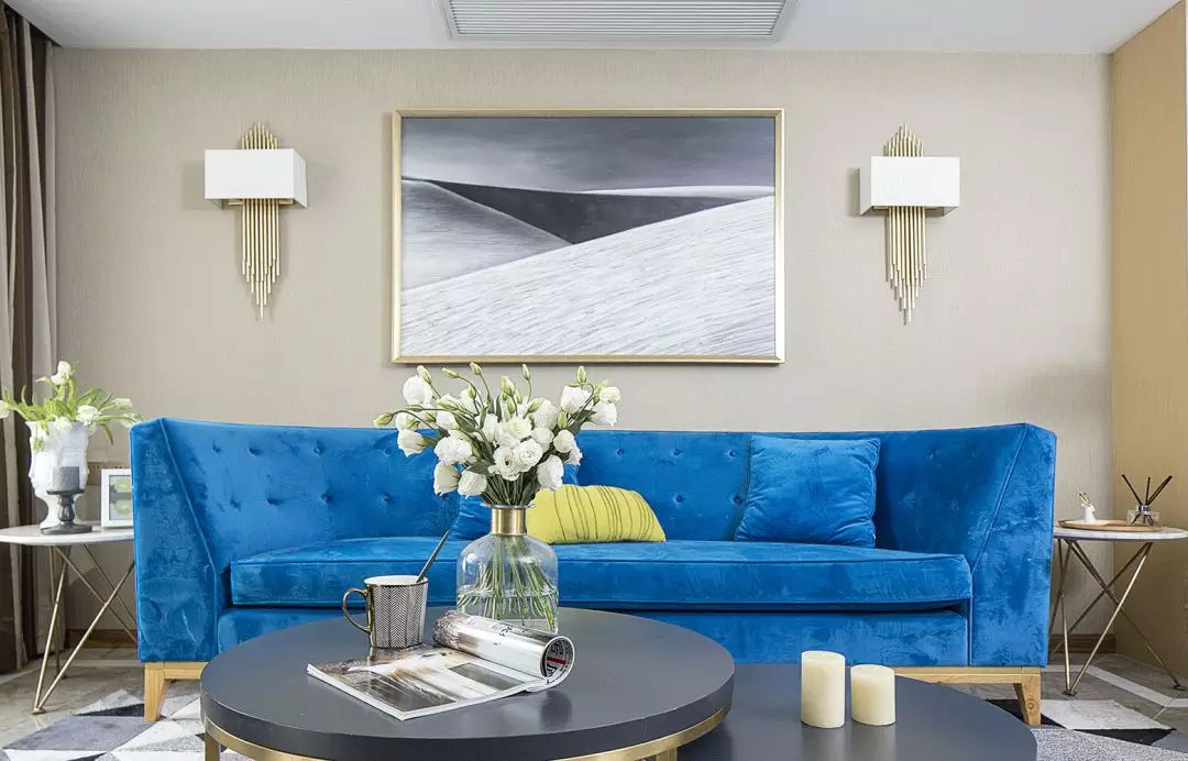 這個(gè)空間同樣延續(xù)了時(shí)下流行的現(xiàn)代輕奢風(fēng)格,除了標(biāo)配元素黃銅、大理石、玻璃等多元材質(zhì)的混搭外,藍(lán)色絲絨沙發(fā)的配置,帶來了一種時(shí)尚、高貴的既視感。