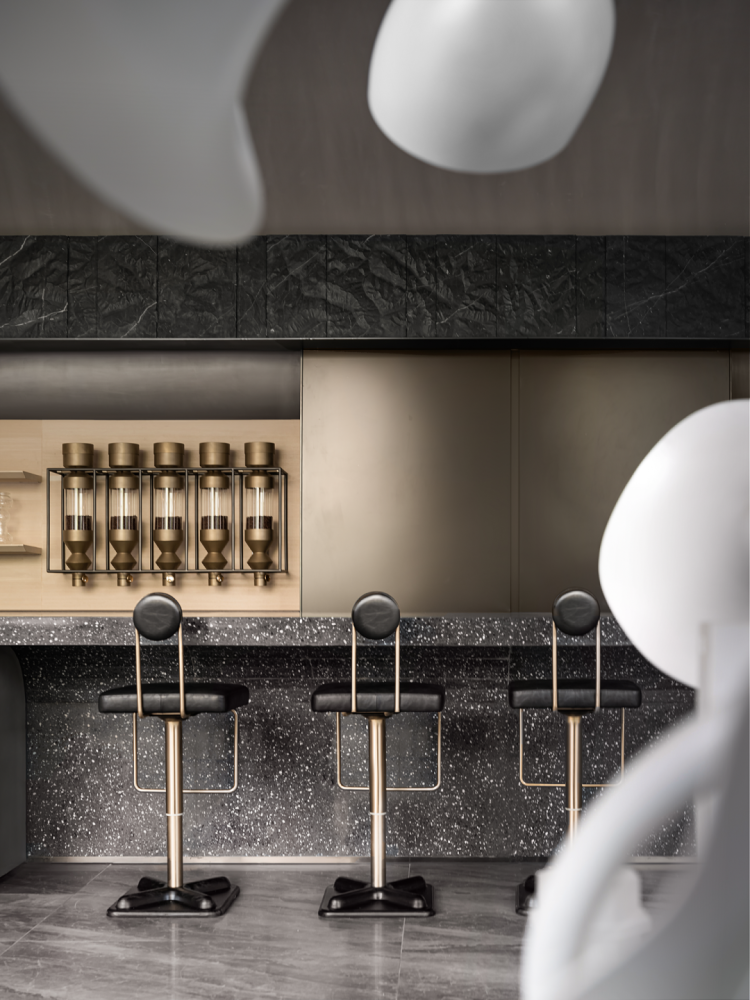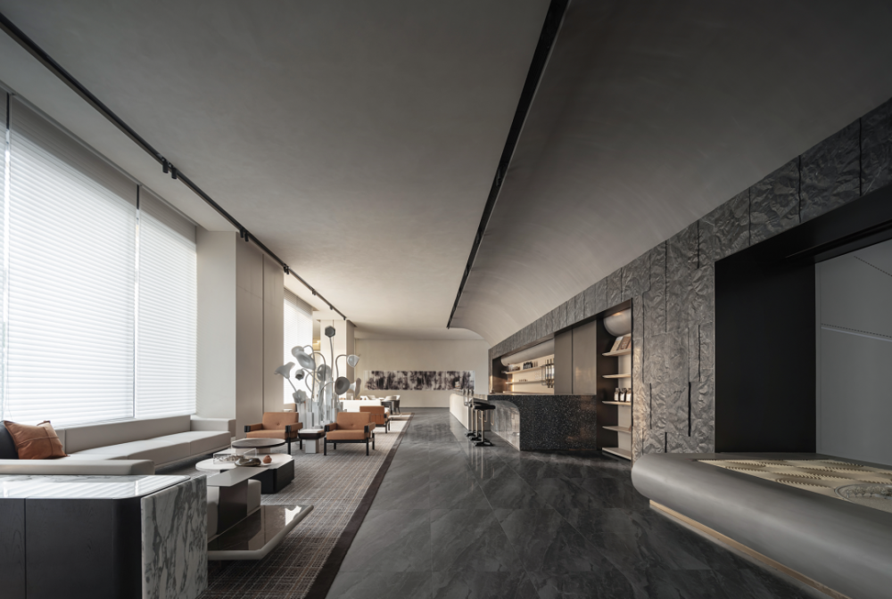 沙盤區(qū)域咖啡吧臺在前續(xù)的位置上相連,確立著空間動線的方向。與此同時,巨大的微水泥弧形曲墻面構(gòu)筑物,將沙盤與咖啡吧臺微微向內(nèi)包裹,營造出輕松而熙攘的都市街頭氛圍。