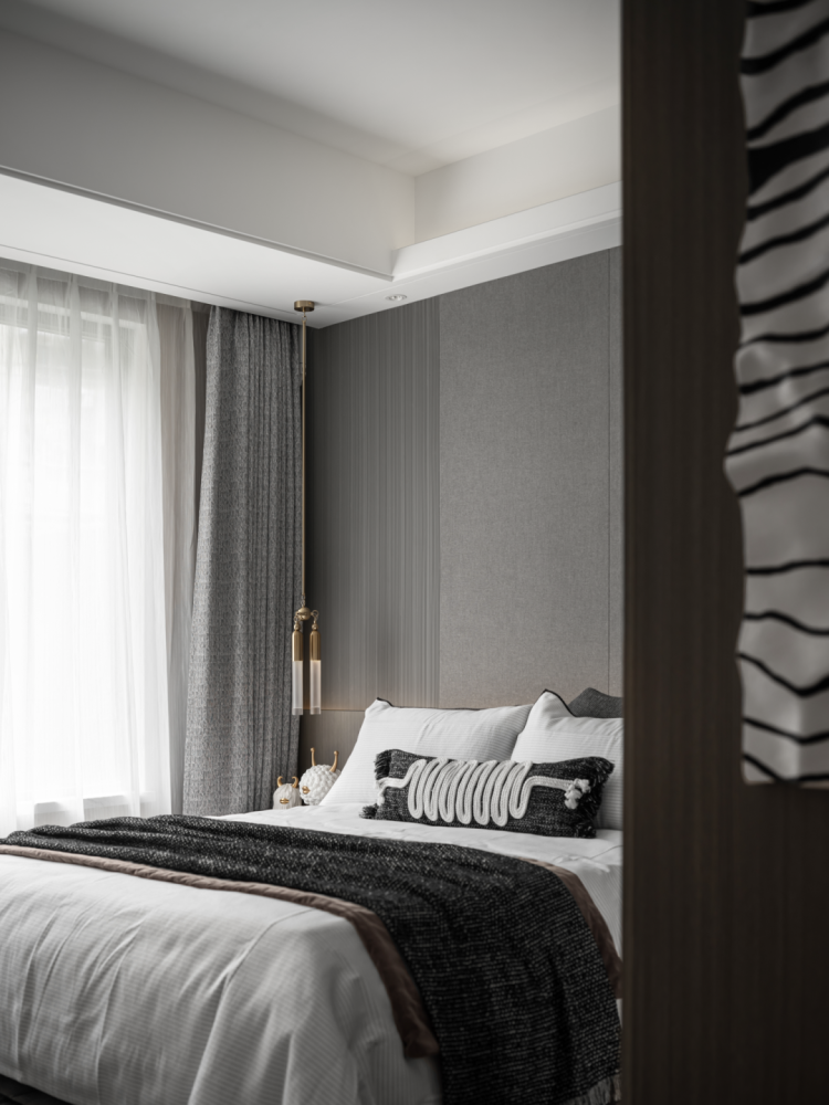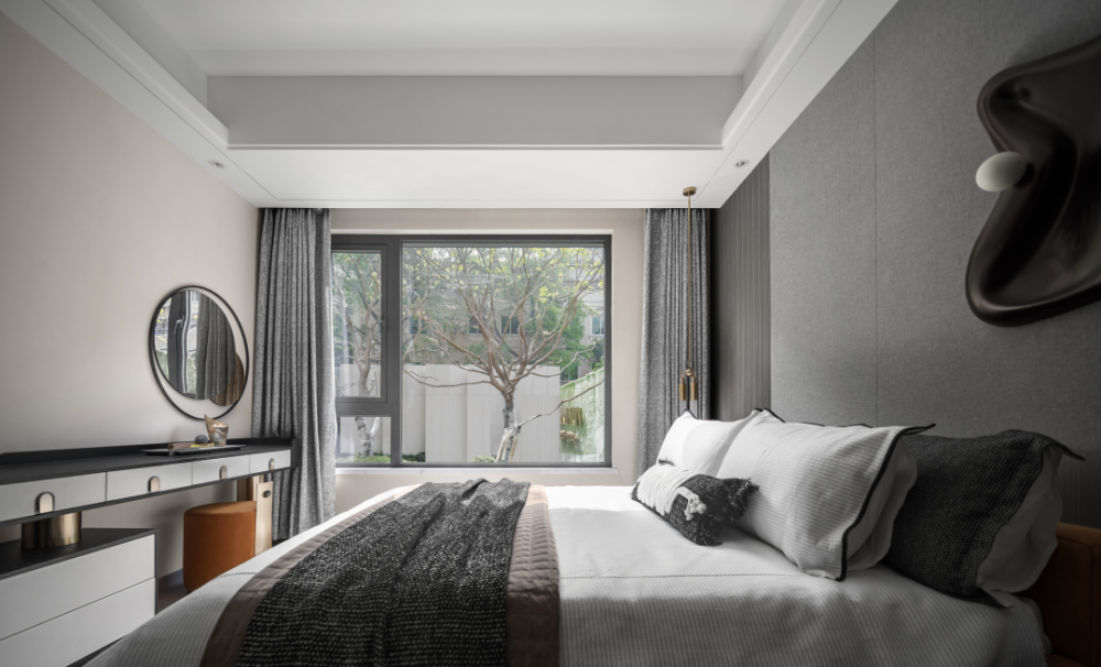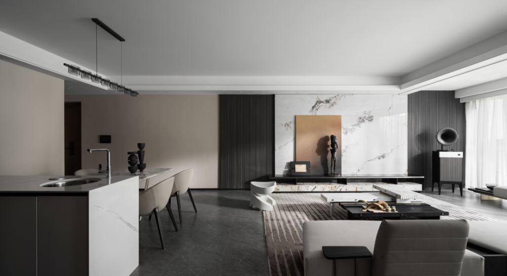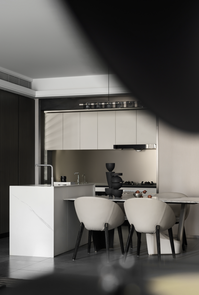 精裝修交付標(biāo)準(zhǔn)樣板間內(nèi),以中島臺為過渡的開放式客餐廳,從視覺上擴(kuò)展了空間的通透性;客廳外側(cè),戶外陽臺的內(nèi)化處理,提升空間利用率的同時,更進(jìn)一步加深了內(nèi)部空間自由延伸狀態(tài)。