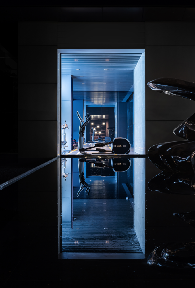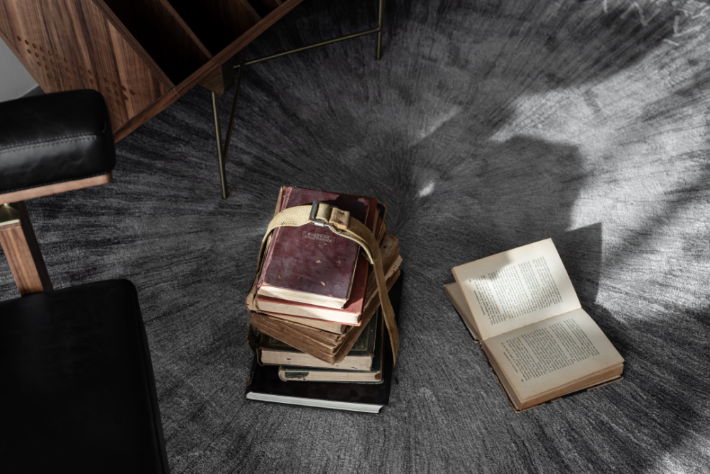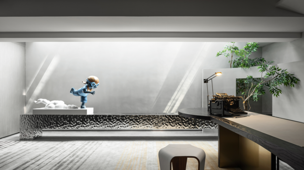 在負(fù)一層的公共活動區(qū),老式打字機、電影膠片、老式電影放映機等眾多老物件,以藝術(shù)收藏的方式進(jìn)入空間細(xì)節(jié);帶有古典意蘊的書案和置于中心位置的火塘,則以傳統(tǒng)的形態(tài)參與進(jìn)現(xiàn)代生活。位于空間最內(nèi)側(cè)采光天井,使得陽光洗墻而下,現(xiàn)在時與過去時交融,新的感知被某種瞬時性所激活。