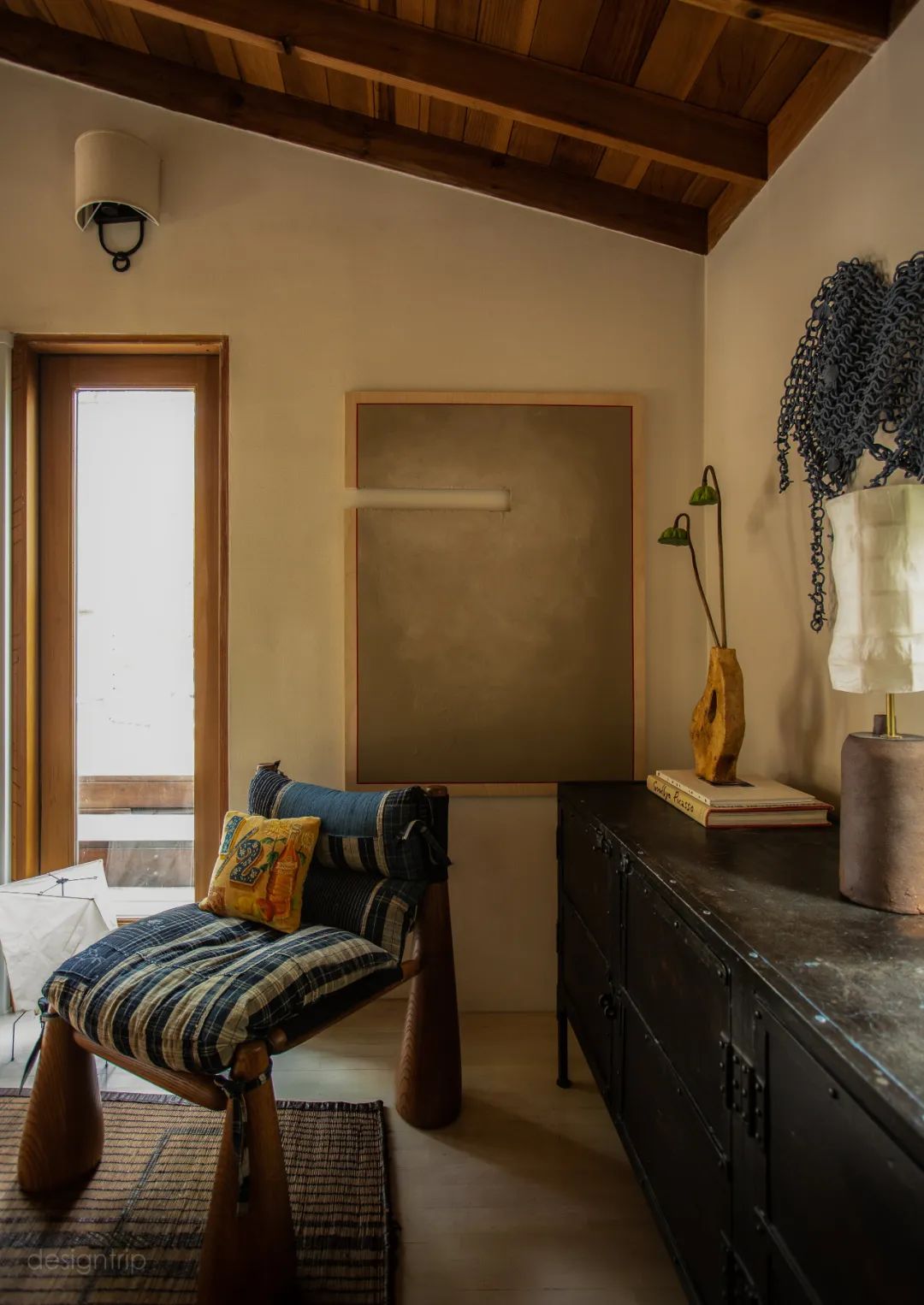 主臥室的墻壁刷上了柔和的橄欖色,為Danielle 的復古家具展出打造了一個具有觸感的背景。低飽和度的窗簾盛邀戶外光線和景觀的演出,復古的家具有條不紊地講述它們的故事;一把質(zhì)樸的蒲扇將人引入了一個無限懷念的過去里,那里是自然的天地,隨風而起的是陣陣的竹香。