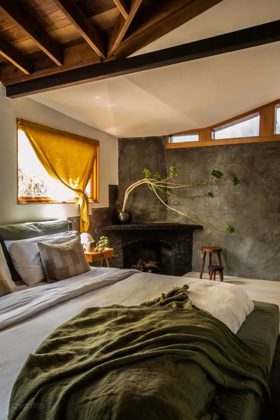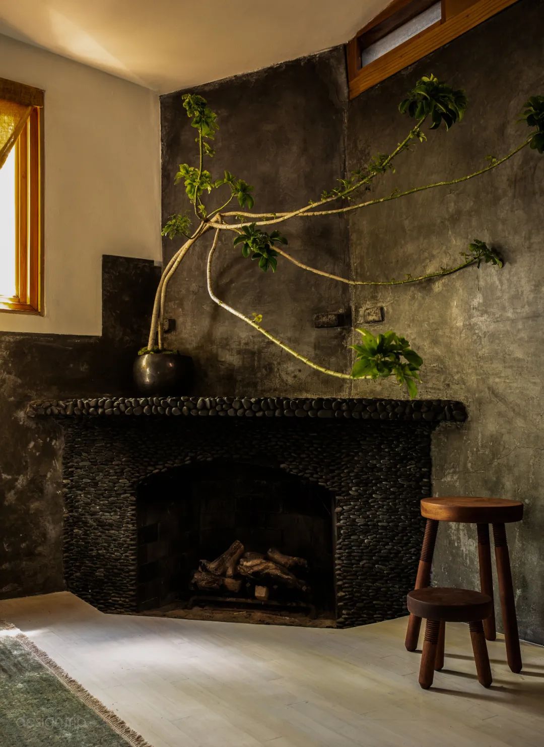 Lauren的審美非常傾向于侘寂,她十分關(guān)注瑕疵的感覺,這也讓她在石膏身上看到了這種屬于瑕疵的美。石膏不僅可以承受磨損,且有豐富的色調(diào)變化,對于一所侘寂來說十分受用。于是,在設計偏向于溫暖的臥室里,Lauren亦將石膏作為墻面裝飾的一部分,還搭配了光滑鵝卵石制成的壁爐、樹枝,捕捉了天然的藝術(shù)特性。