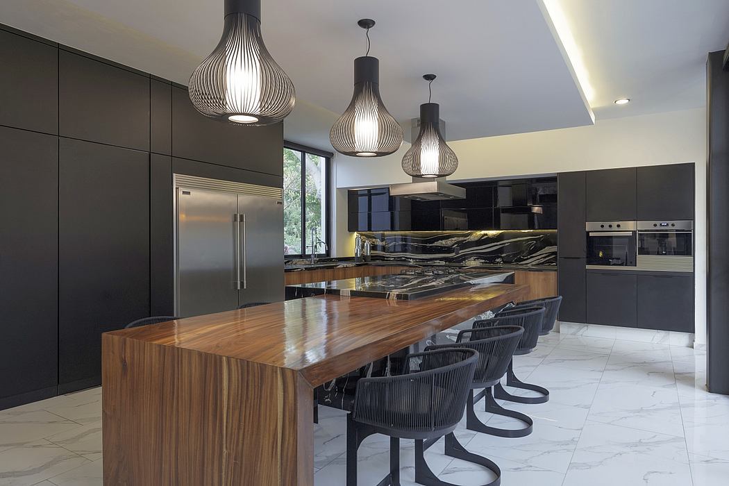氣勢(shì)磅礴的鐵匠螺旋樓梯是結(jié)構(gòu)解決方案的一個(gè)基本元素,并允許一個(gè)清晰的空間,在這個(gè)雕塑元素和建筑構(gòu)件之間產(chǎn)生對(duì)話,如鋼柱和梁,涂成黑色,最終融入了建筑的美學(xué)房子。喚醒溫暖的感覺(jué)是材料的任務(wù)。parota、Blanco Galarza 石頭和白色地板;覆蓋空間喚起熱帶氣候的情感。其他元素,如屏幕格子,保護(hù)用戶免受方向和太陽(yáng)的影響,在房子的表面產(chǎn)生在某些時(shí)間有節(jié)奏的光和影。
