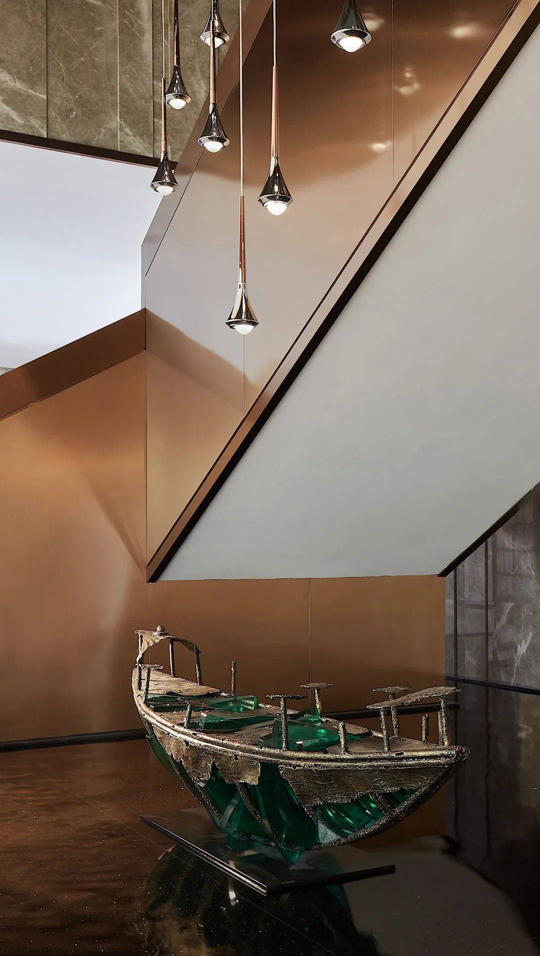 藝術(shù)的美感體現(xiàn)在整體造型和內(nèi)部細節(jié),樓梯作為售樓處設(shè)計中必不可少的大體量裝置,從建筑學(xué)與美學(xué)的角度來看,樓梯同時是上下兩個空間的焦點,也是設(shè)計師最值得發(fā)揮想象的地方。在樓梯的設(shè)計中也經(jīng)常會與藝術(shù)裝置、藝術(shù)吊燈相結(jié)合,打造一處既保留功能性,又充滿觀賞性的樓梯空間。